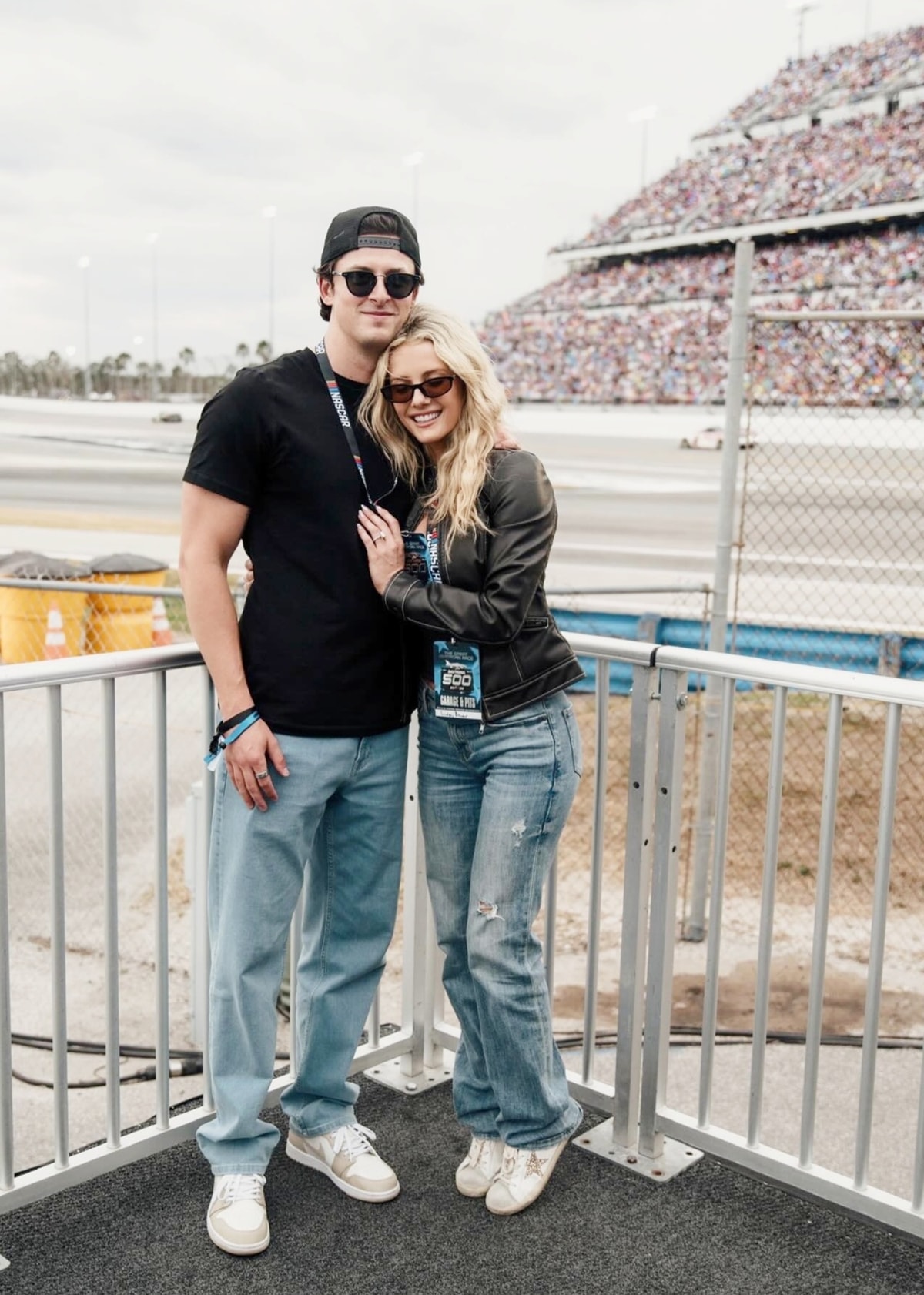 Bạn trai song hành Lindsay Brewer ở chặng đua Daytona International Speedway, hôm 16/2. Nhiều fan đánh giá Drew Solomon năng động với kiểu phối áo thun, quần jeans, giày thể thao và mốt đội mũ ngược. Lindsay Brewer diện phong cách tương tự, tạo khác biệt với áo khoác da.