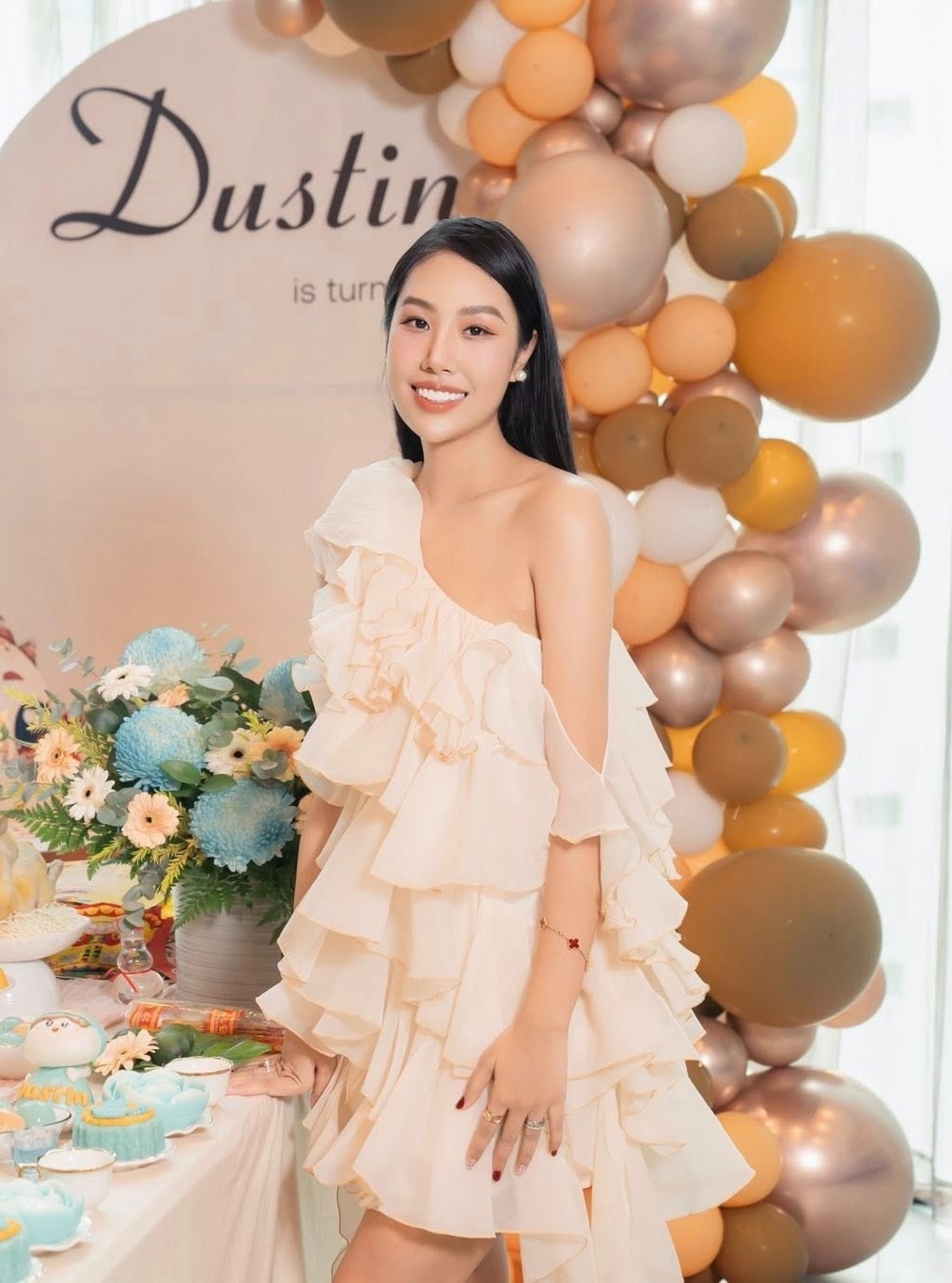 Tăng Khánh Chi, 30 tuổi, bạn gái của diễn viên Quang Minh, 67 tuổi, thường diện váy xuyên thấu, trễ vai, tôn đường cong.