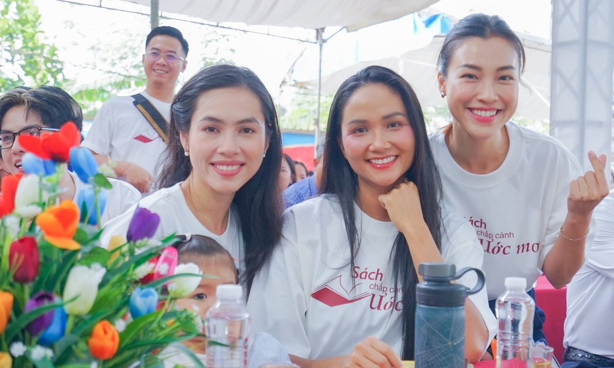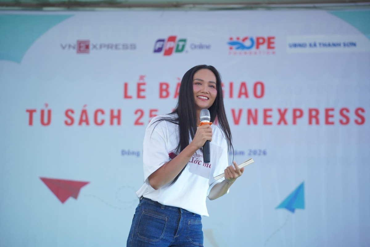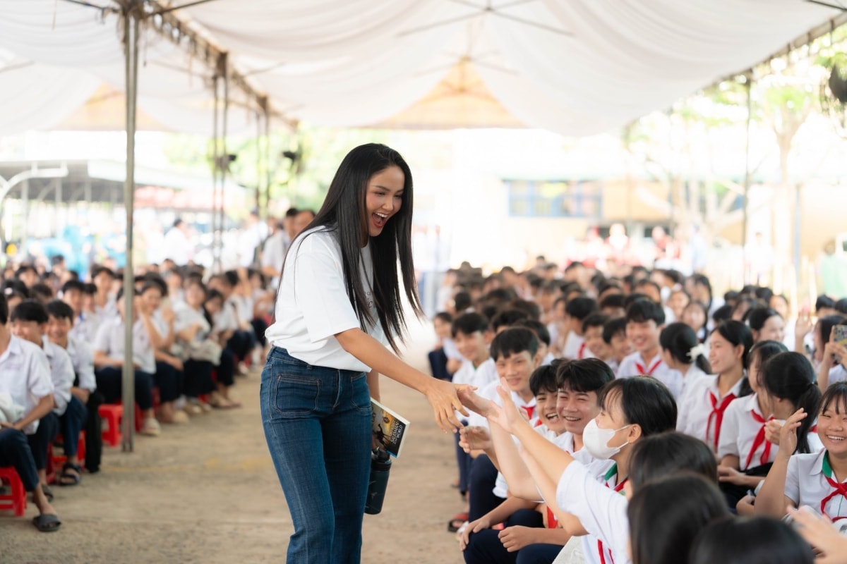 Hoa hậu H'Hen Niê giao lưu ký tặng sách, catwalk cùng học sinh trường THCS - THPT Tây Sơn, xã Thanh Sơn, hôm 29/3.