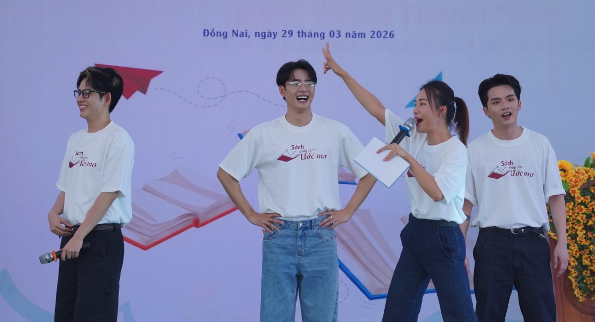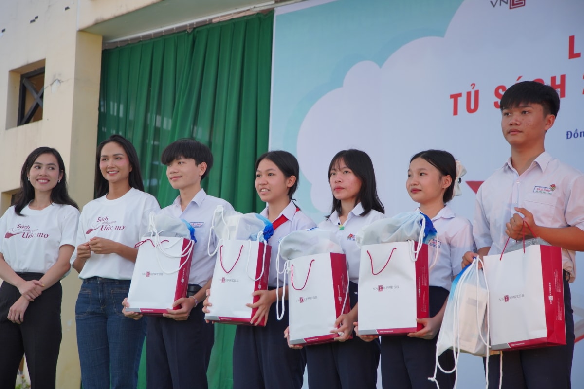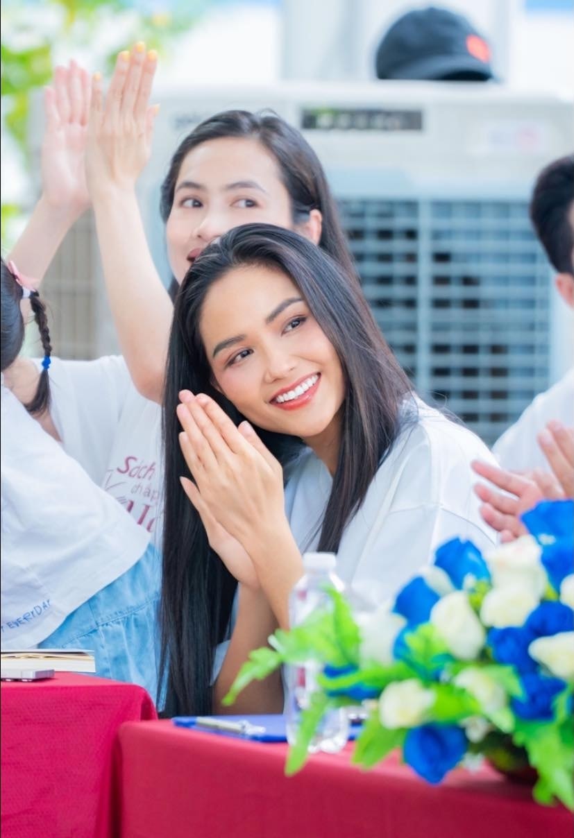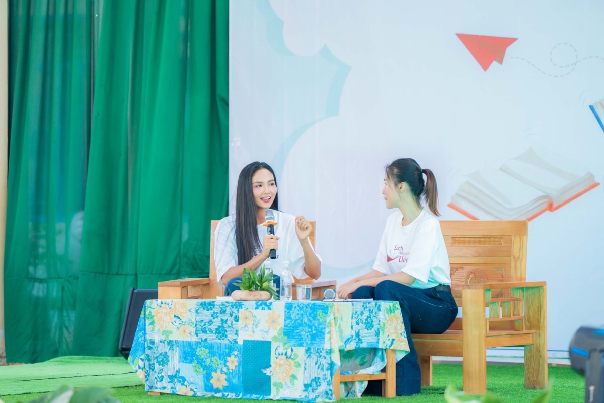 Hoa hậu H'Hen Niê giao lưu ký tặng sách, catwalk cùng học sinh trường THCS - THPT Tây Sơn, xã Thanh Sơn, hôm 29/3.