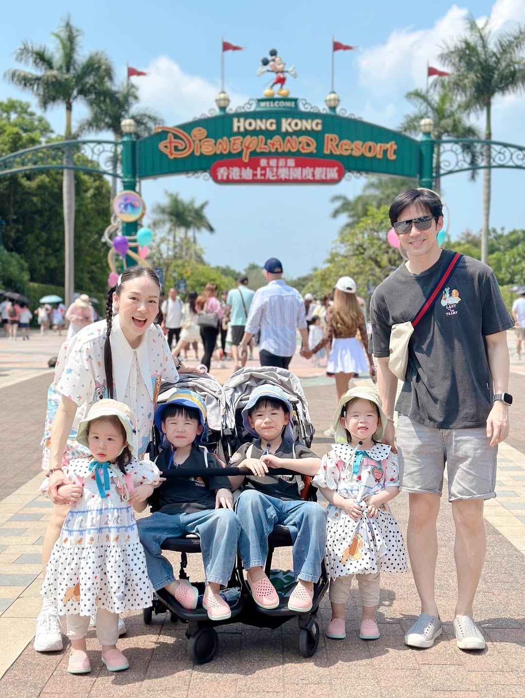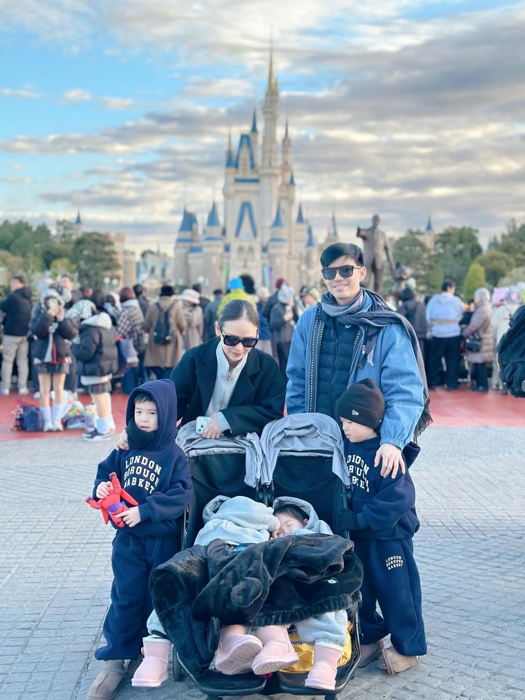 Beam - Oil cùng bốn con khám phá các khu vui chơi nổi tiếng ở Hong Kong (trái) và Nhật Bản hồi năm ngoái. Oil Atiporn không hoạt động nghệ thuật nhưng luôn xuất hiện trong các sự kiện cùng chồng.