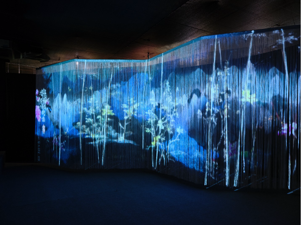 Không gian tiếp theo là những tiết tấu mộc, vang giọng hát của nghệ nhân Ca trù. Màn trình diễn Trướng rủ - Màn che của nghệ sĩ Nguyễn Hoàng Giang, là tấm trướng mỏng với máy chiếu ứng dụng Trí tuệ nhân tạo (AI), tự động khắc họa lên những hình ảnh theo lời trực tiếp của bản Ca trù đang vang vọng. Kết quả, hình ảnh không hề lặp lại trong suốt thời gian trình chiếu.