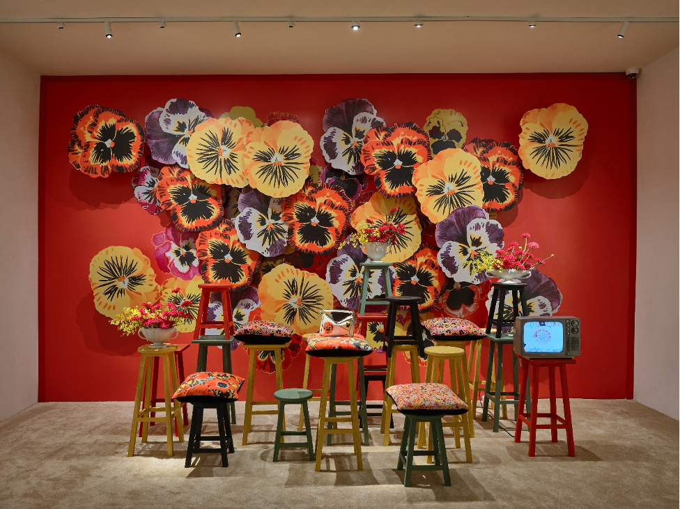 Trước khi rời sảnh Giao Thoa, người xem được chiêm ngưỡng không gian nghệ thuật sắp đặt của thương hiệu thời trang Loewe, kết hợp nghệ sĩ Joe Brainard mang nhiều màu sắc đương đại, pha những mảng màu sắc và văn hóa Việt Nam.