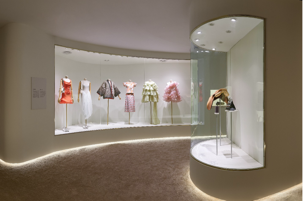 Đến với phòng Di Sản, người xem sẽ ngắm nhìn các bộ sưu tập thời trang từ nhiều thập niên trước, được trích xuất từ kho lưu trữ của các nhà mốt hàng đầu thế giới. Đơn cử, mẫu áo thứ ba từ trái qua nằm trong bộ sưu tập Thu Đông năm 1983 do nhà sáng lập Kenzo Takada thiết kế. Thời gian này được coi là một trong những mốc sáng tạo đỉnh cao của ông, mang cảm hứng trang phục truyền thống xứ hoa anh đào, cùng họa tiết hiện đại vào thời bấy giờ.