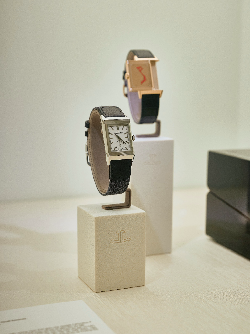 Trong ảnh là mẫu đồng hồ Jaeger-LeCoultre Reverso, một trong những bộ sưu tập biểu tượng nhất của hãng với tùy chọn màu vàng hồng hoặc vàng trắng. Chiếc Reverso trưng bày là phiên bản đặc biệt, chế tác dành riêng cho thị trường Việt Nam với dải đất hình chữ S màu đỏ, có cơ chế mặt xoay (Reverible Case) theo sở thích của chủ nhân.