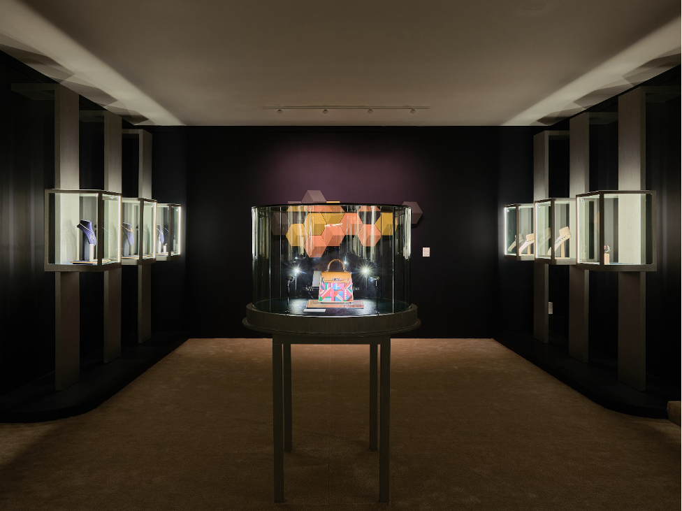 Chính giữa căn phòng là không gian của Hermès với chiếc Birkin Faubourg phiên bản giới hạn, một trong những chiếc túi Birkin đắt giá nhất thế giới. Mặt túi lấy cảm hứng từ mặt tiền cửa hàng flagship lịch sử của nhà mốt tại Paris, chế tác theo kỹ thuật Sellier hiếm thấy.