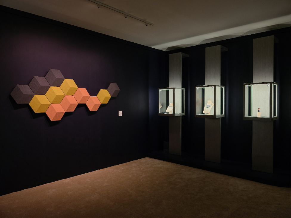 Trong căn phòng Kiệt Tác, triển lãm trưng bày các chế tác trang sức và đồng hồ cao cấp đến từ Chaumet, Piaget hay Patek Philippe. Gắn trên bức tường (trái) là hệ thống loa Bang & Olufsen Beosound Shape, có khả năng sắp xếp dạng mô-đun, tùy biến màu sắc phù hợp không gian nội thất nhằm tạo nên tác phẩm nghệ thuật độc đáo trong không gian.