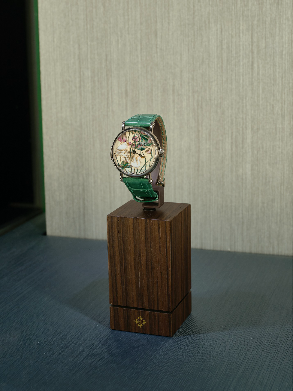 Mẫu đồng hồ Patek Philippe Calatrava - Reference 5077 nằm trong bộ sưu tập nghệ thuật thủ công hiếm (Rare Handcrafts), thường được sản xuất rất giới hạn hoặc độc bản. Trong ảnh là chiếc thuộc sở hữu của một khách hàng tại Việt Nam, có họa tiết chủ đề thiên nhiên được chế tác tráng men thủ công (cloisonné enamel dial) tinh xảo. Ngoài ra, mẫu đồng hồ này cũng có tính năng điểm chuông Minute Repeater.