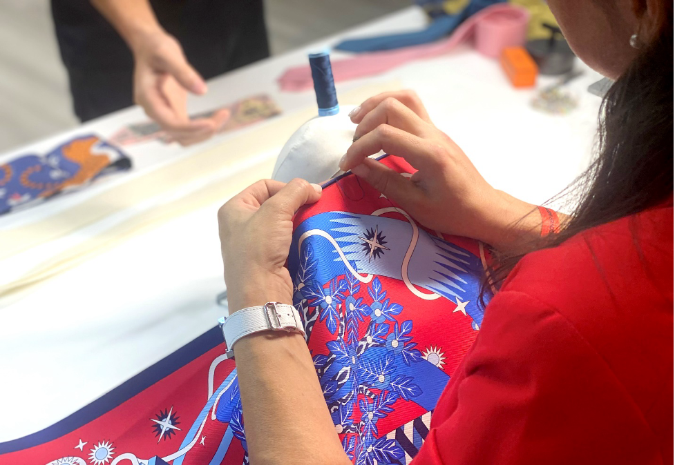 Không gian phòng Nghệ Nhân đưa người xem đến những trải nghiệm nghề thủ công của các thương hiệu Hermès, Longchamp và Hanoia. Trong ảnh, một nghệ nhân Hermès thực hiện kỹ thuật khâu vắt sổ thủ công kiểu Roulotté. Sợi chỉ khâu có cùng màu viền khăn, được khâu từ mặt phải đến phần mép khăn, cuối cùng cuộn tròn và không để lộ đường viền chỉ.
