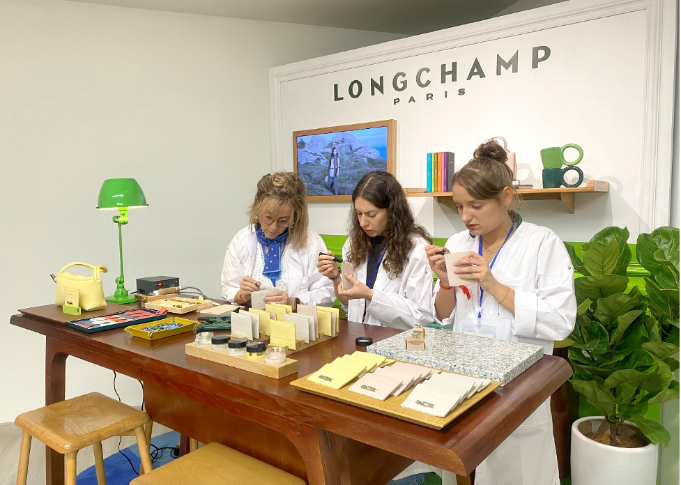 Kế bên là những nghệ nhân từ Longchamp (Paris, Pháp) hoàn thiện thủ công những món đồ da của hãng, như chiếc ví đựng thẻ. Kỹ nghệ gia công đồ da là một trong những yếu tố quan trọng hàng đầu tại Longchamp, đây cũng là thương hiệu đầu tiên bọc tẩu hút thuốc bằng chất liệu da co giãn, cho phép người dùng tùy chỉnh và cá nhân hóa sản phẩm.