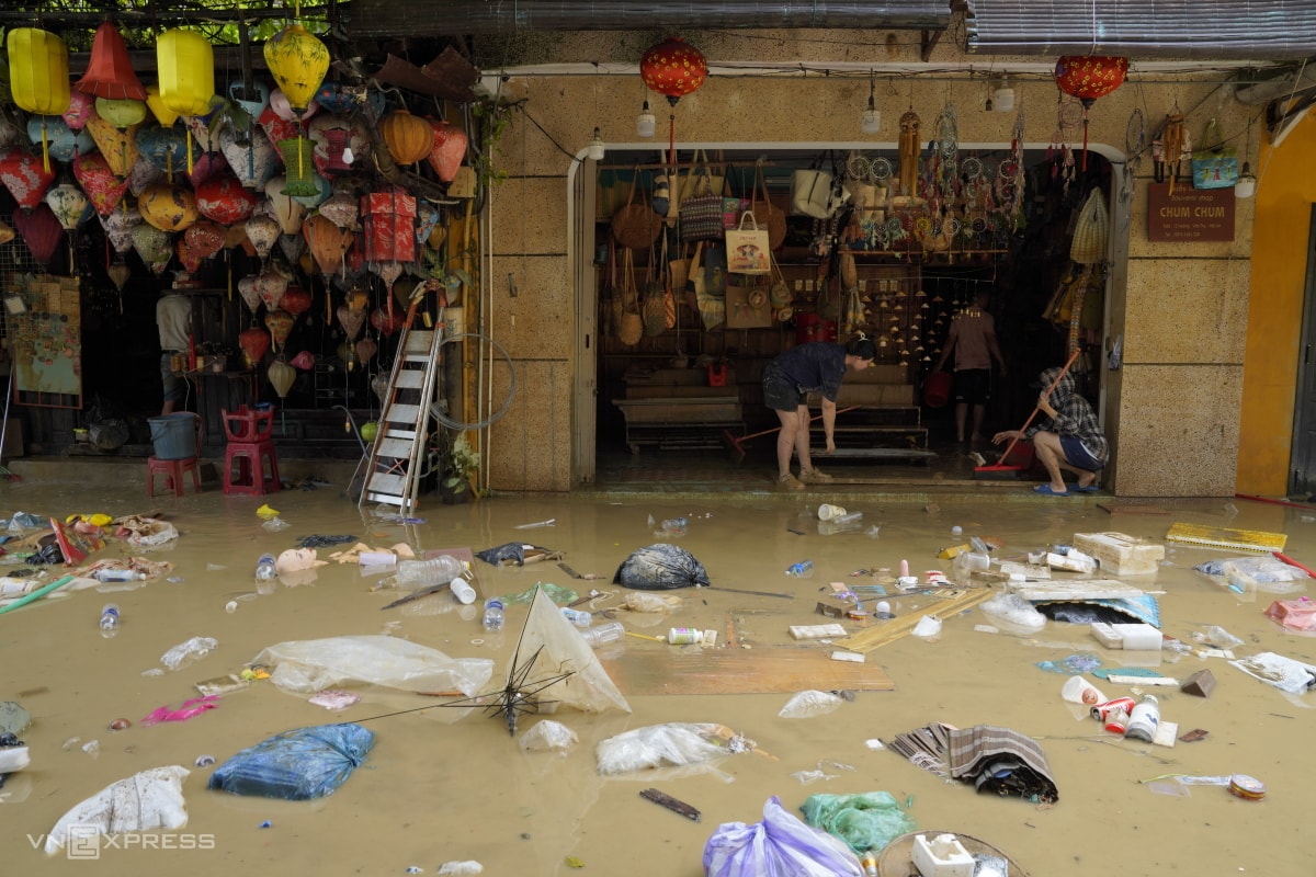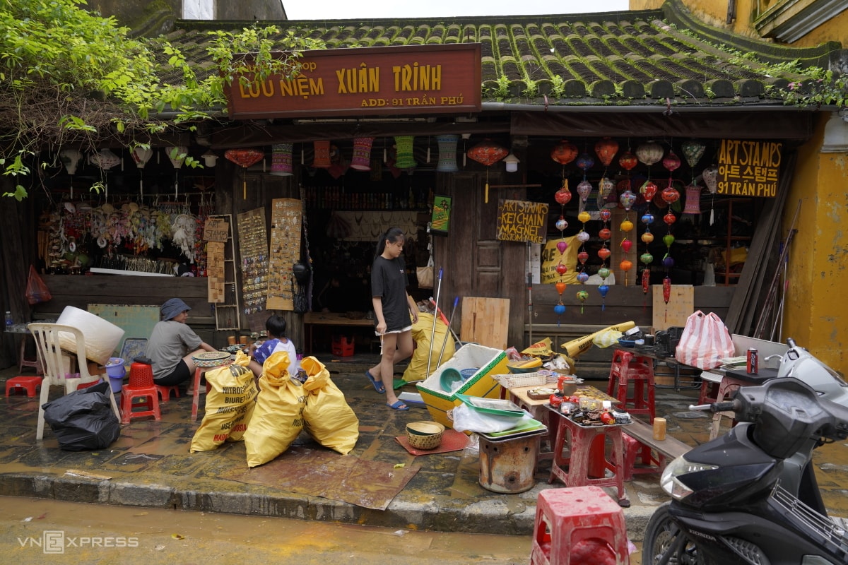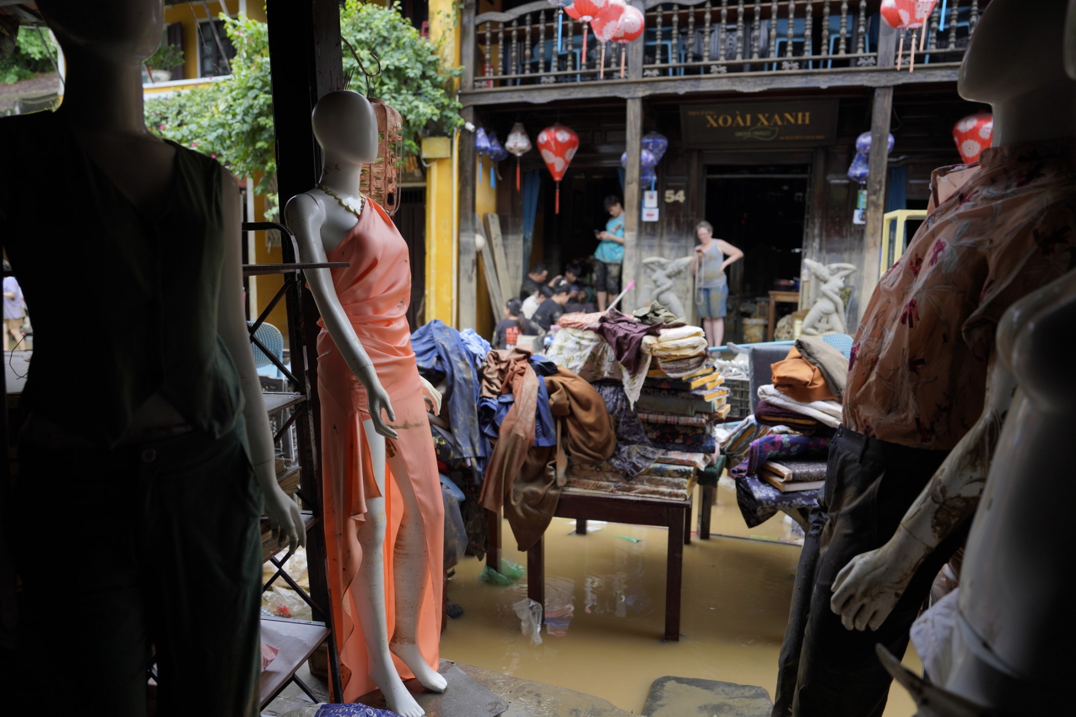 Đợt lũ lịch sử khiến hàng loạt các cửa hàng, nhà hàng kinh doanh trên những con phố sầm uất nhất phố cổ Hội An bị ngập, khi nước rút, người dân mang hàng hoá ra phơi với mong muốn vớt vát được chút tài sản.