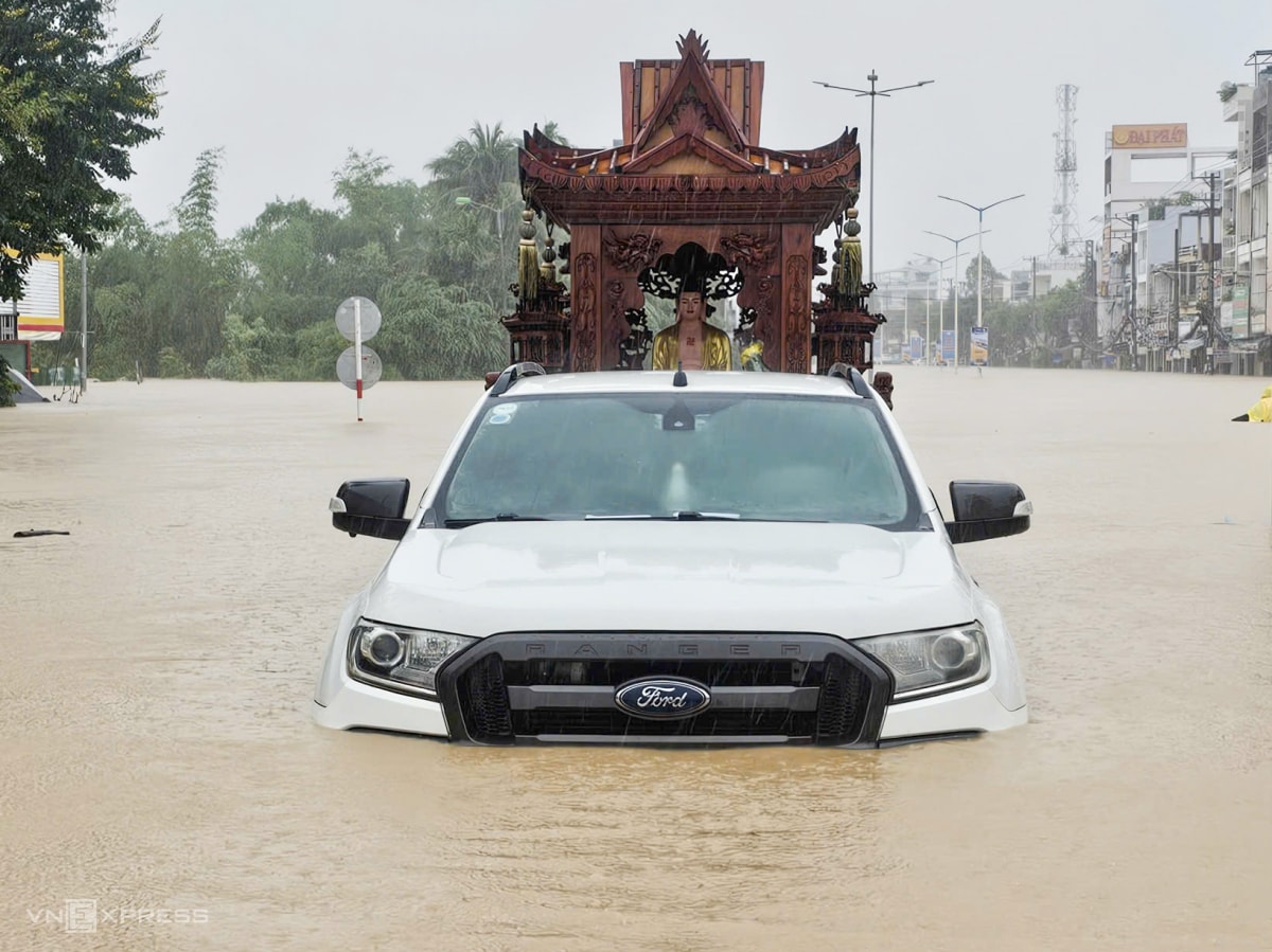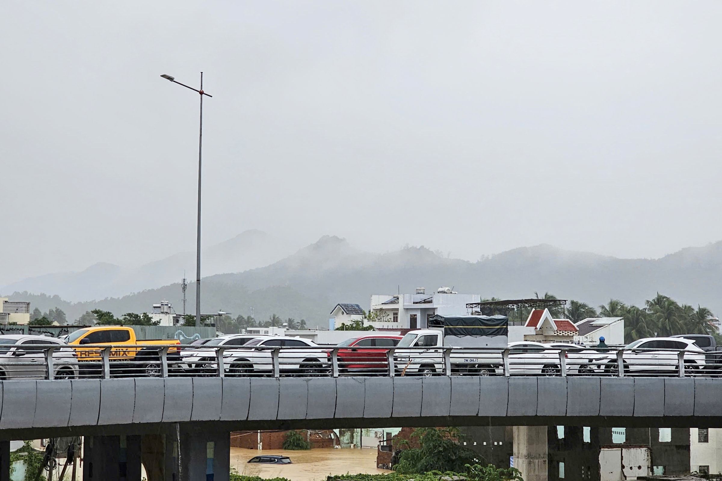 Mưa lớn cùng nước lũ dâng cao khiến hàng trăm ôtô mắc kẹt trên các tuyến đường trung tâm Nha Trang, nhiều người chờ cứu hộ xe, sáng 20/11.