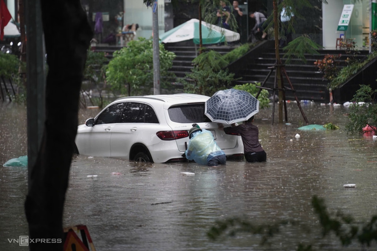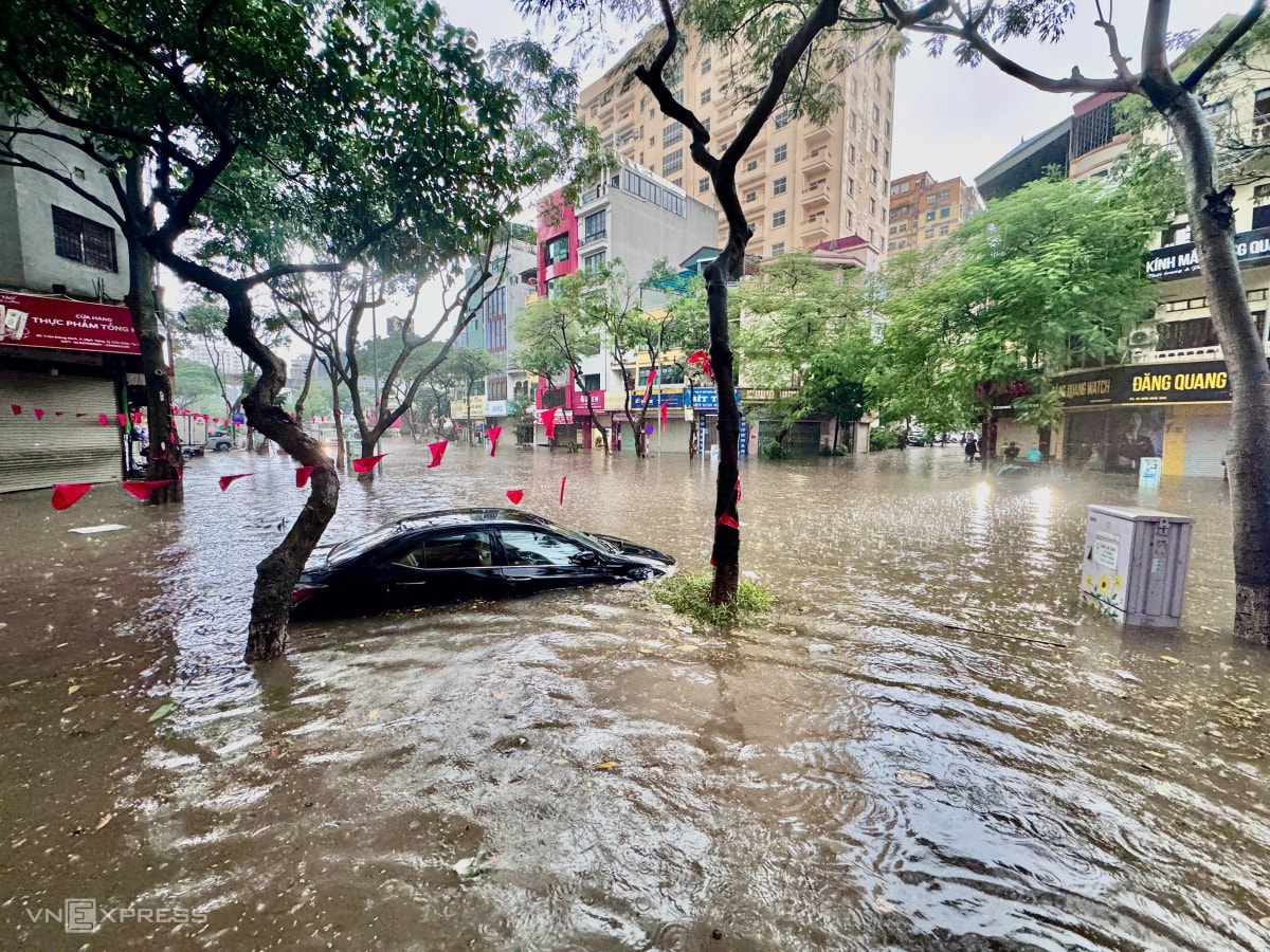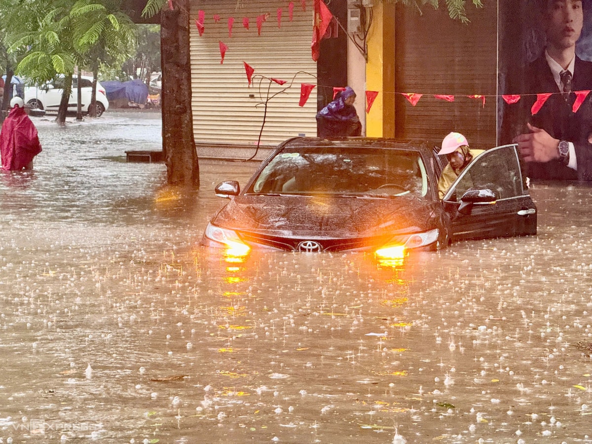 Mưa lớn nhiều giờ sáng 7/10 khiến nhiều tuyến phố Hà Nội ngập sâu, ôtô chết máy giữa đường, xe máy không thể di chuyển trong biển nước.