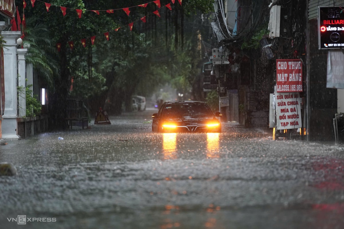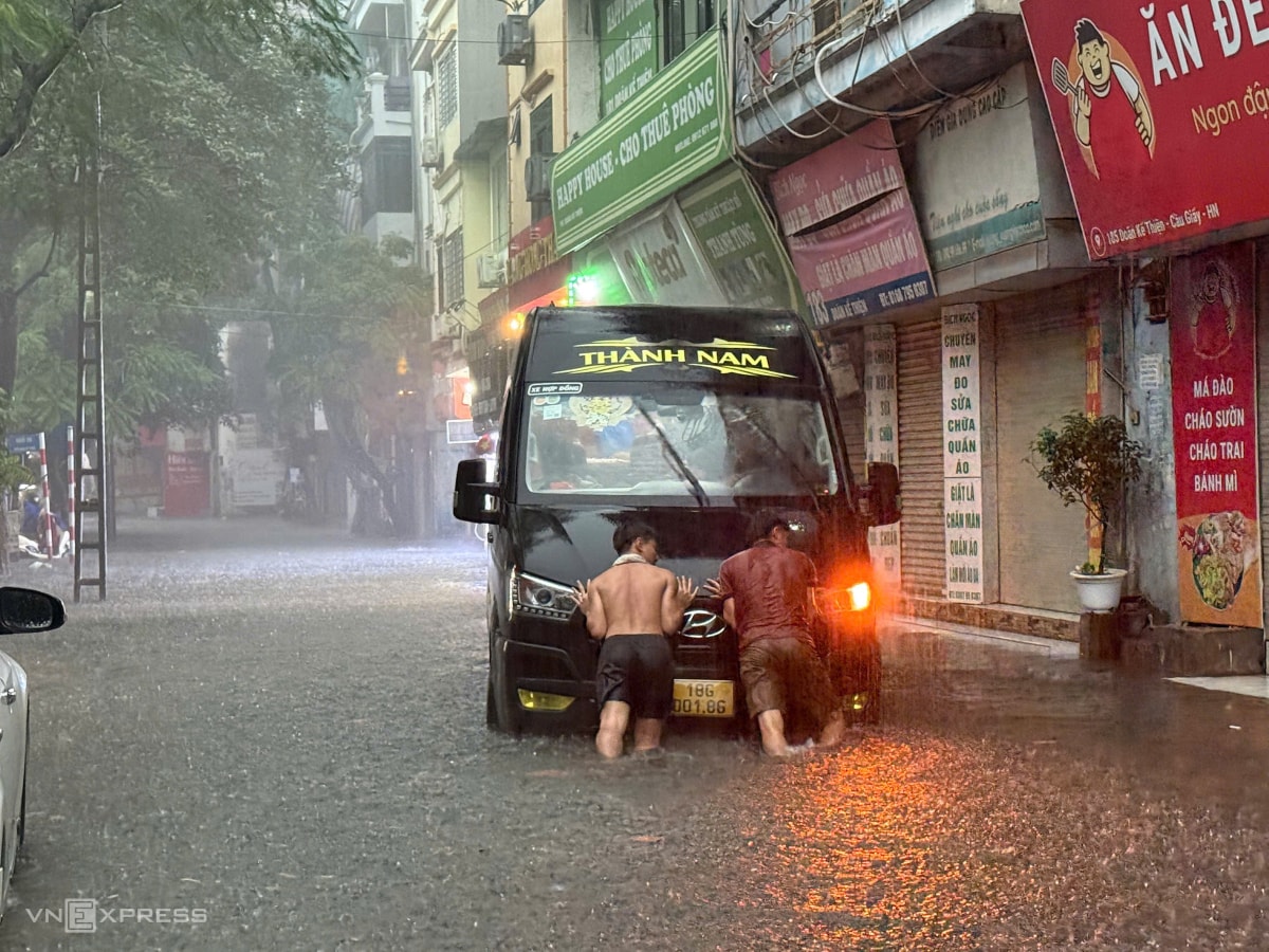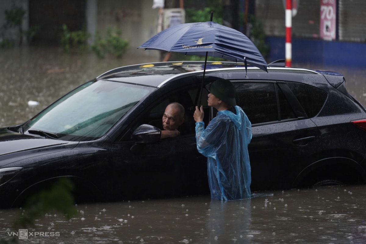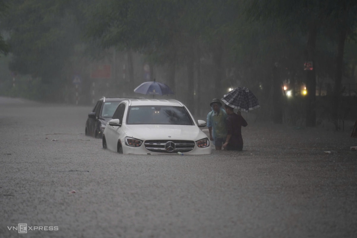 Mưa lớn nhiều giờ sáng 7/10 khiến nhiều tuyến phố Hà Nội ngập sâu, ôtô chết máy giữa đường, xe máy không thể di chuyển trong biển nước.