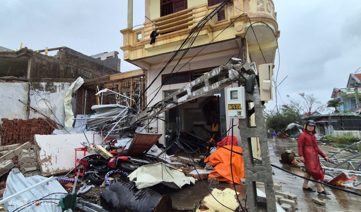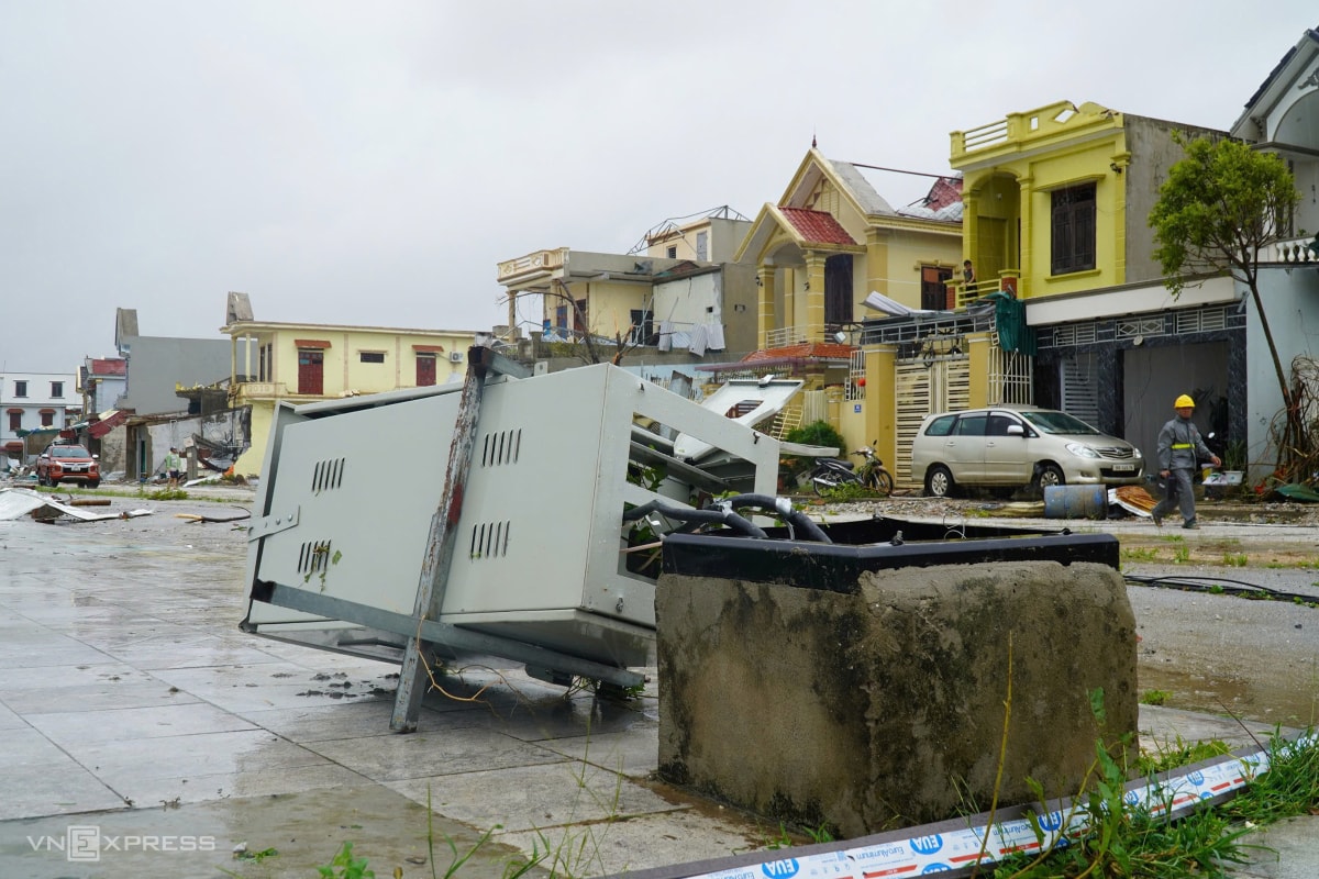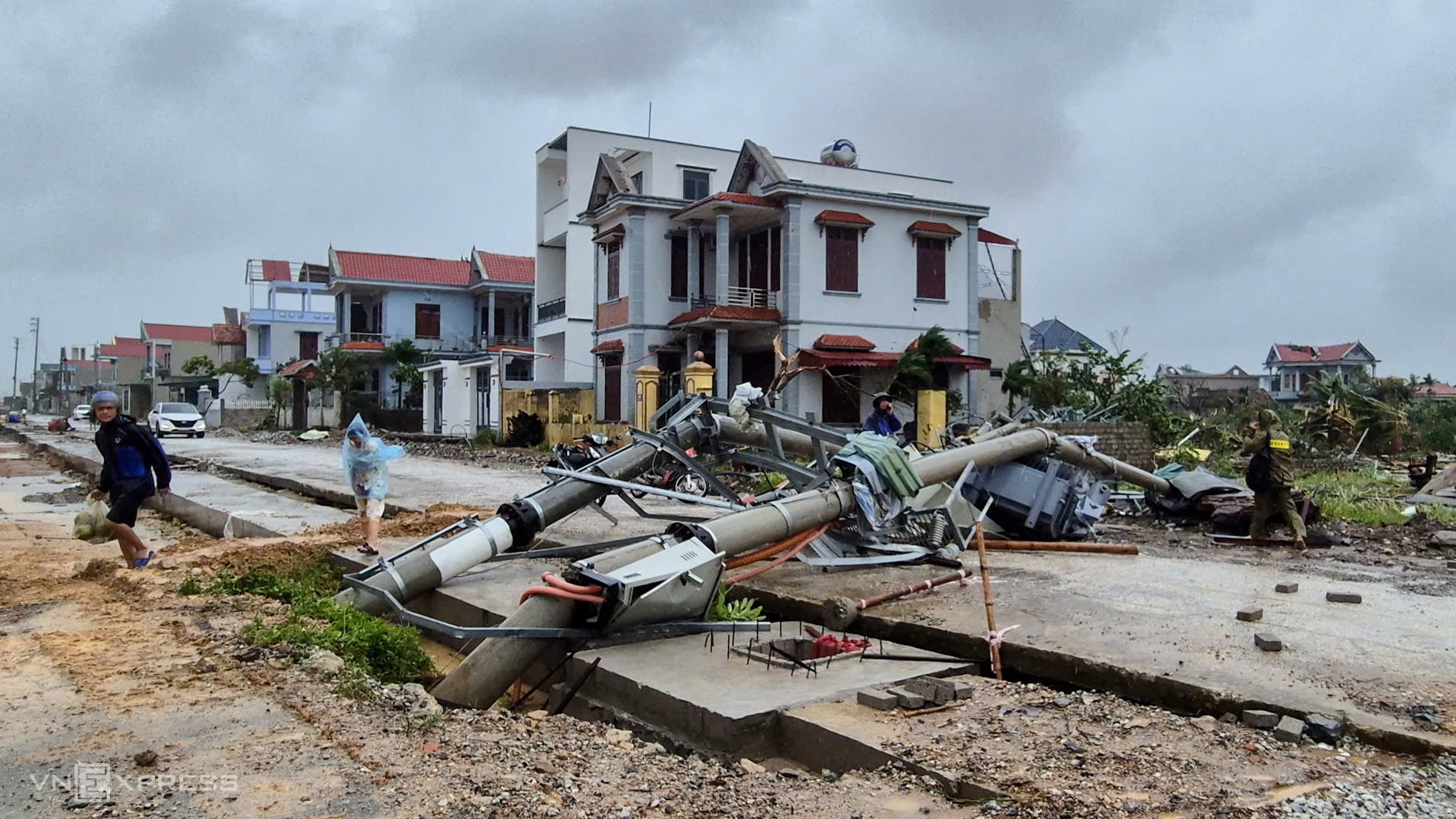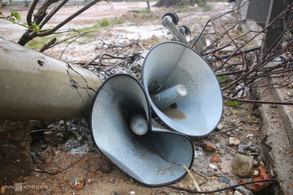 Gió bão Bualoi quật gãy hàng loạt trụ điện, cột viễn thông, loa phát thanh ở Thanh Hoá, Nghệ An, Hà Tĩnh, dây điện vương vãi ngổn ngang trên đường.