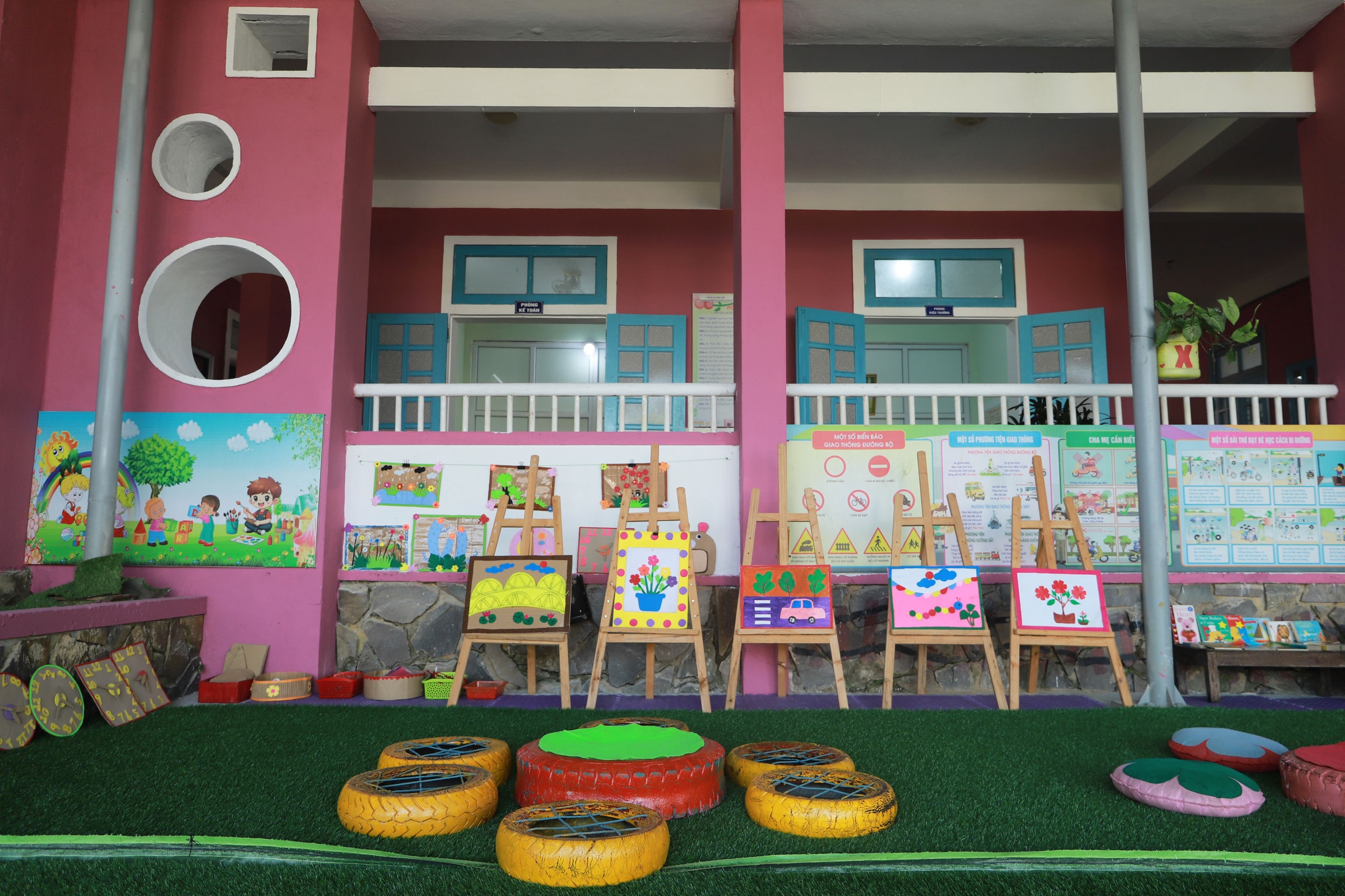 Trường Mầm non Hồng Thượng, xã A Lưới có hơn 50 học sinh. Cách đây vài tháng, lớp sơn hồng bạc màu loang nổ, nay "khoác lớp áo" hồng rực rợ, tạo niềm vui phấn khởi cho cả cô, trò và phụ huynh.