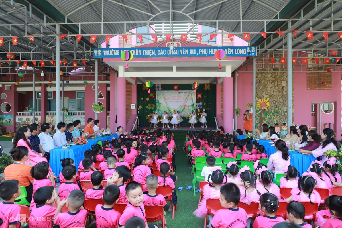Trường mầm non Quang Thái, xã Đan Điền với 268 học sinh rực vàng trong màu áo mới dưới ánh nắng.