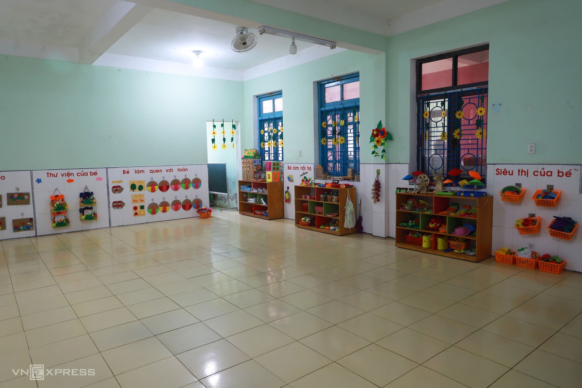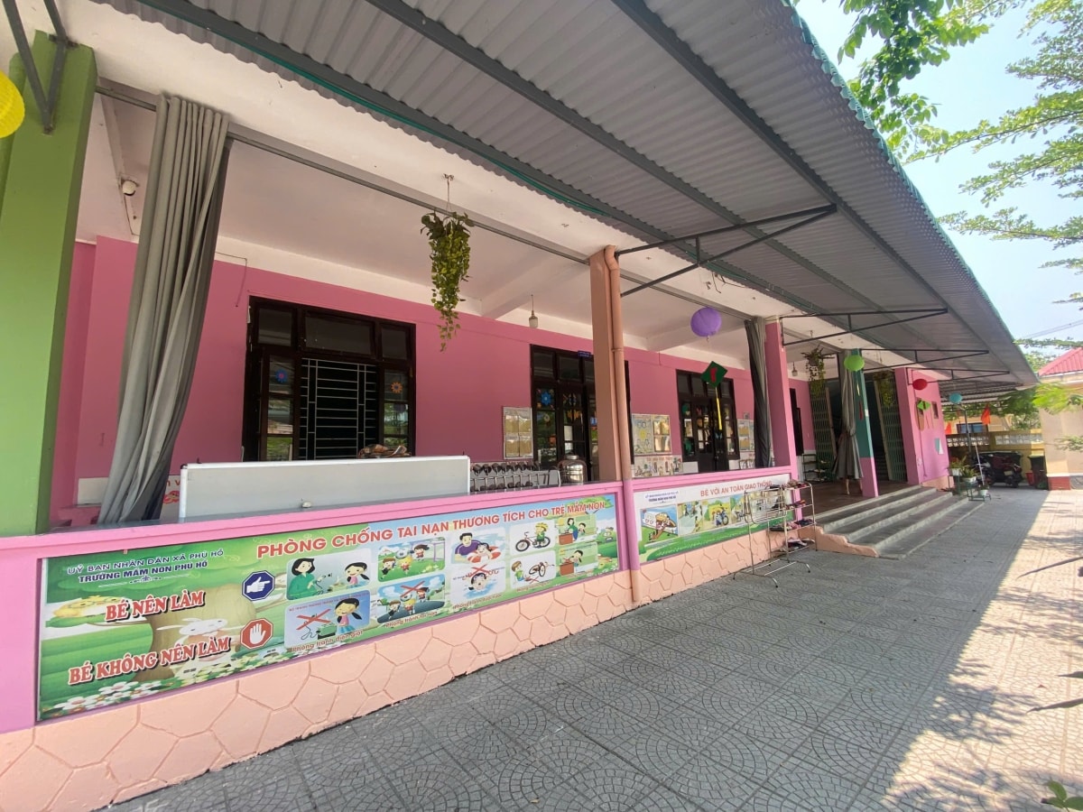 Trường Mầm non Phú Hồ, xã Phú Hồ có 200 học sinh. Không chỉ sơn mới, các mảng trần bung rơi cũng được sửa chữa hoàn thiện.