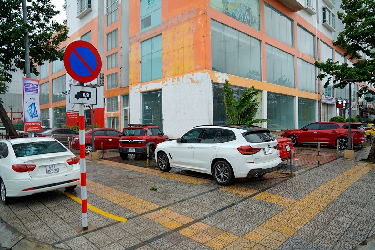Trên vỉa hè đường Hàm Nghi, đoạn trước chung cư Hoàng Anh Gia Lai, khoảng 30 ôtô của cư dân được di chuyển từ tầng hầm lên đỗ tạm. Vỉa hè này cao khoảng 0,3 m so với mặt đường. Kể từ sau đợt mưa lớn đầu tháng 12/2018 khiến hàng chục ôtô, trong đó có một số xe Range Rover, BMW để dưới hầm chung cư bị ngập, cư dân thay đổi thói quen, cứ mưa là đưa xe ra ngoài, đỗ trên vỉa hè.