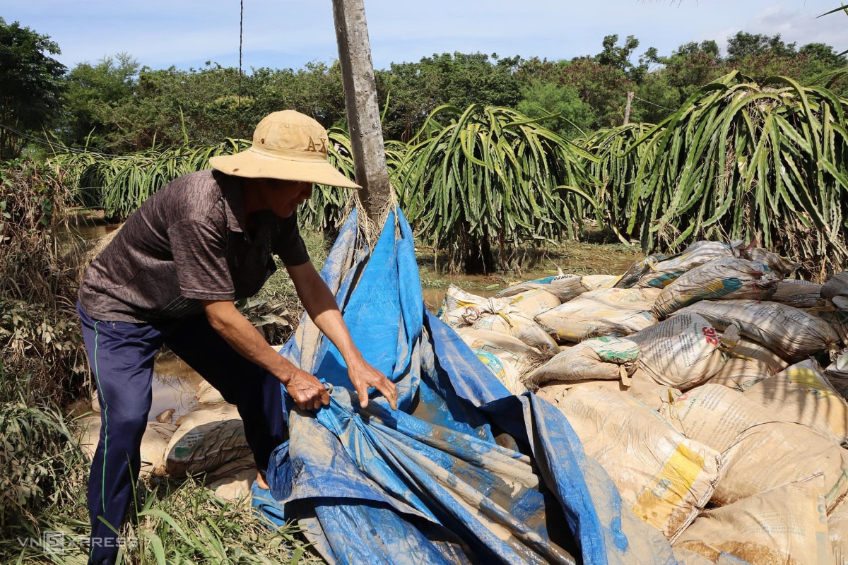 Một lượng lớn phân chim cút được ông Hồng tập kết ở góc vườn chờ bón cho cây cũng bị lũ cuốn hỏng, thiệt hại gần 10 triệu đồng. Ông lo lắng khi nhiều trụ thanh long đã có dấu hiệu thối rễ. “Chăm thanh long như chăm con mọn, đang tuổi cho trái thì gặp nạn. Quá đau khổ”, ông nói và cho hay vụ Tết tới “coi như đói”.