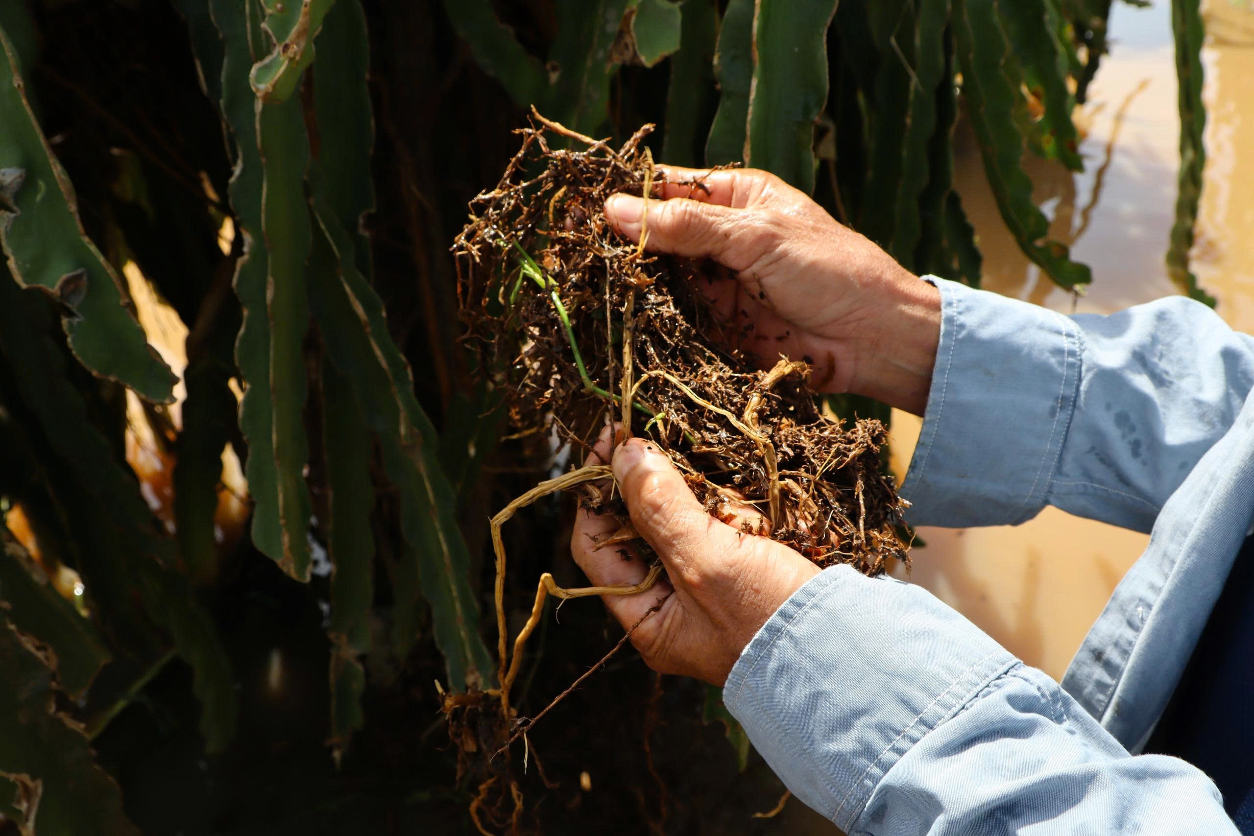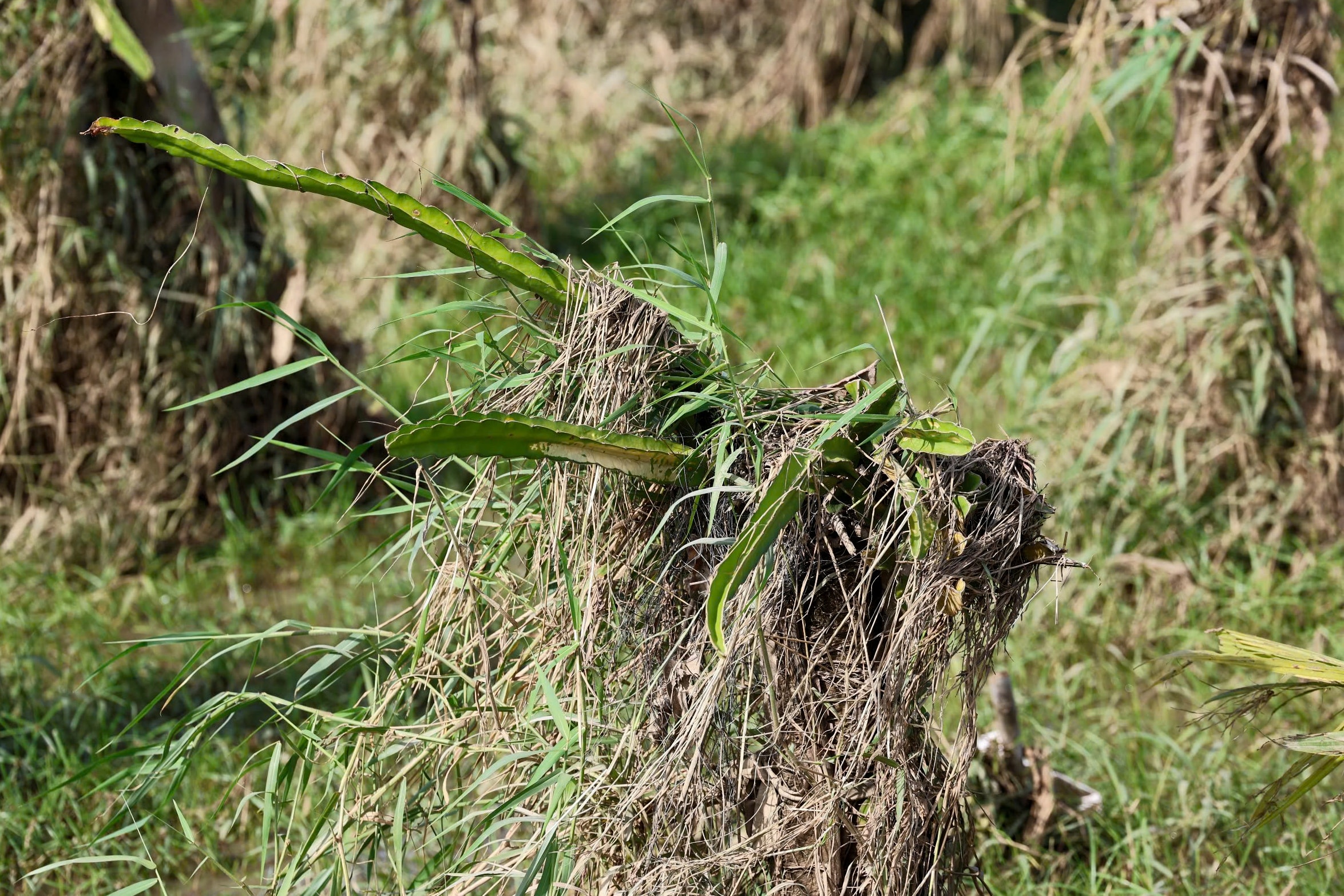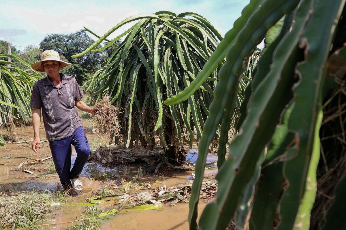 Vườn thanh long hơn 300 trụ của gia đình ông Nguyễn Thanh Hồng gần đó cũng bị thiệt hại nặng. Nước lũ mang theo nhiều cỏ rác dính vào cành trụ thanh long. Ngay khi nước vừa rút, ông ra vườn dọn dẹp vệ sinh.