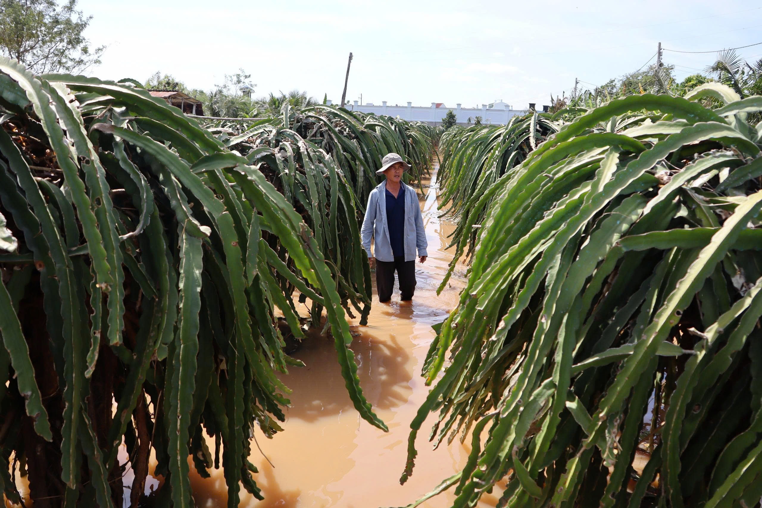 Nhiều vườn trồng thanh long ở xã Hàm Liêm, Hàm Thắng bị nước lũ nhấn chìm, nông dân lo lắng trắng tay, mất Tết.
