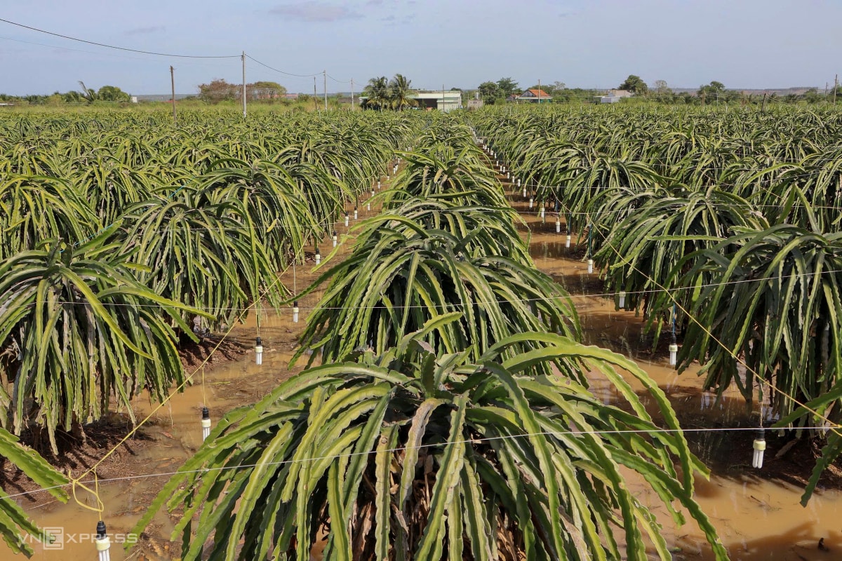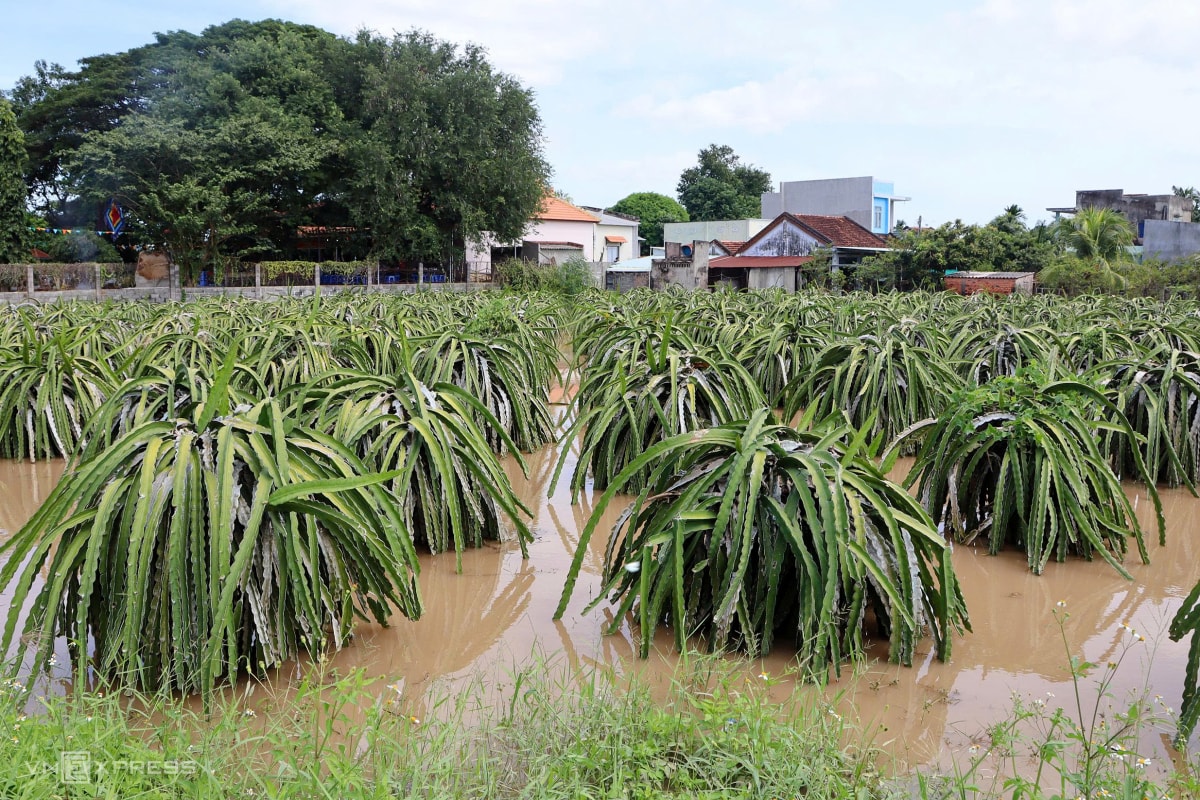 Vườn thanh long ở phường Hàm Thắng ngâm trong nước lũ chờ rút.
