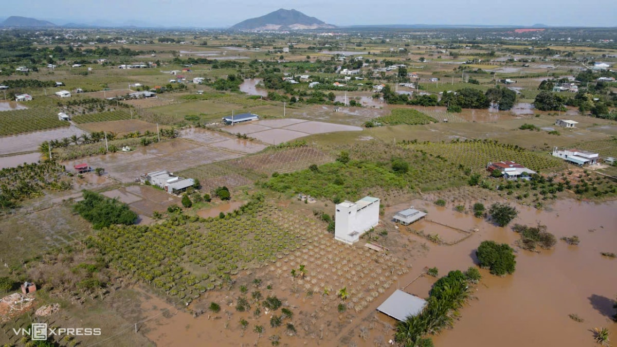 Một góc xã Hàm Liêm với hàng trăm ha thanh long còn ngập sâu trong nước lũ, chiều 5/12. Những ngày qua, do mưa lớn kéo dài kết hợp xả lũ về hạ du Sông Cái đã gây ngập lụt trên diện rộng tại xã Hàm Liêm, phường Hàm Thắng, giáp phường Phan Thiết.