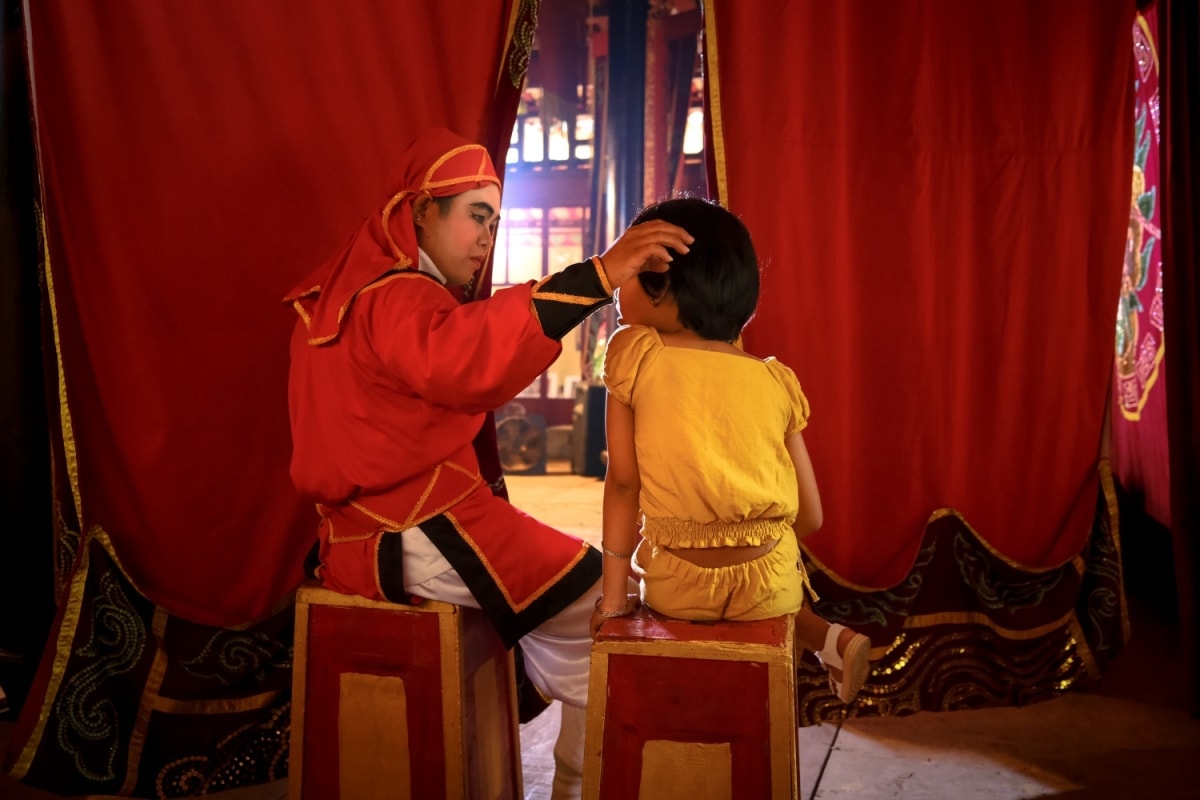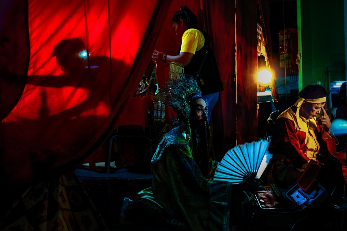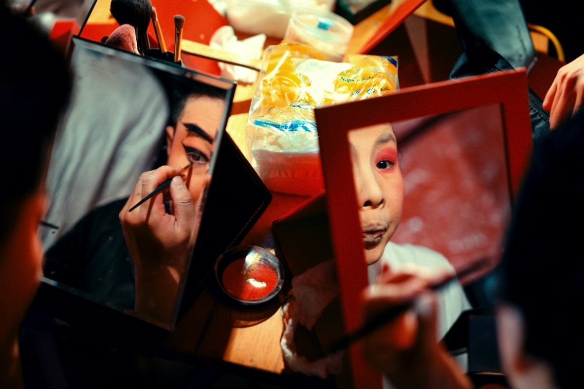 Cảnh nghệ nhân hát bội nghỉ ngơi, trang điểm trước giờ diễn ở đình Nhơn Hòa, Lăng Ông - Bà Chiểu được nhiếp ảnh gia Tín Phùng ghi lại.
