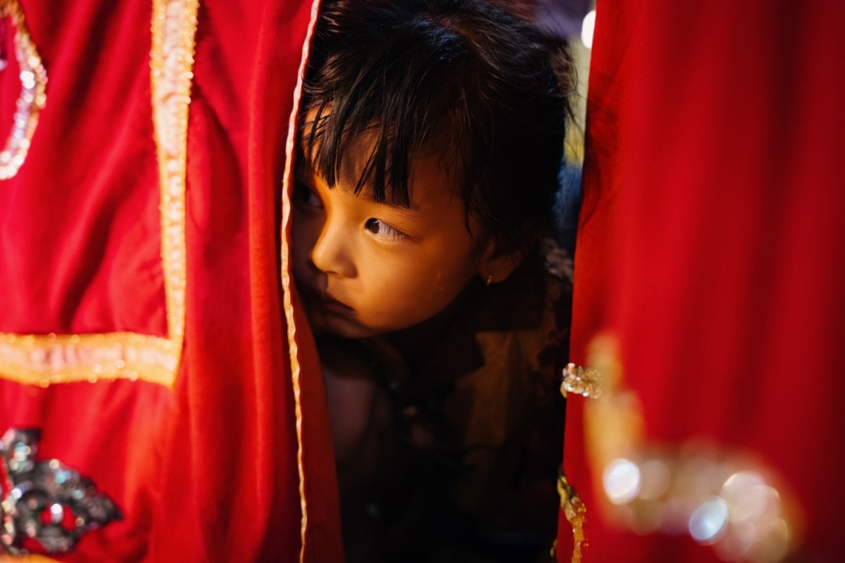 Em bé từ trong cánh gà nhìn các nghệ nhân diễn ở đình Nhơn Hòa. Nơi đây là điểm diễn lâu năm của nhiều gánh cải lương Hồ Quảng, trong đó có đoàn Huỳnh Long.