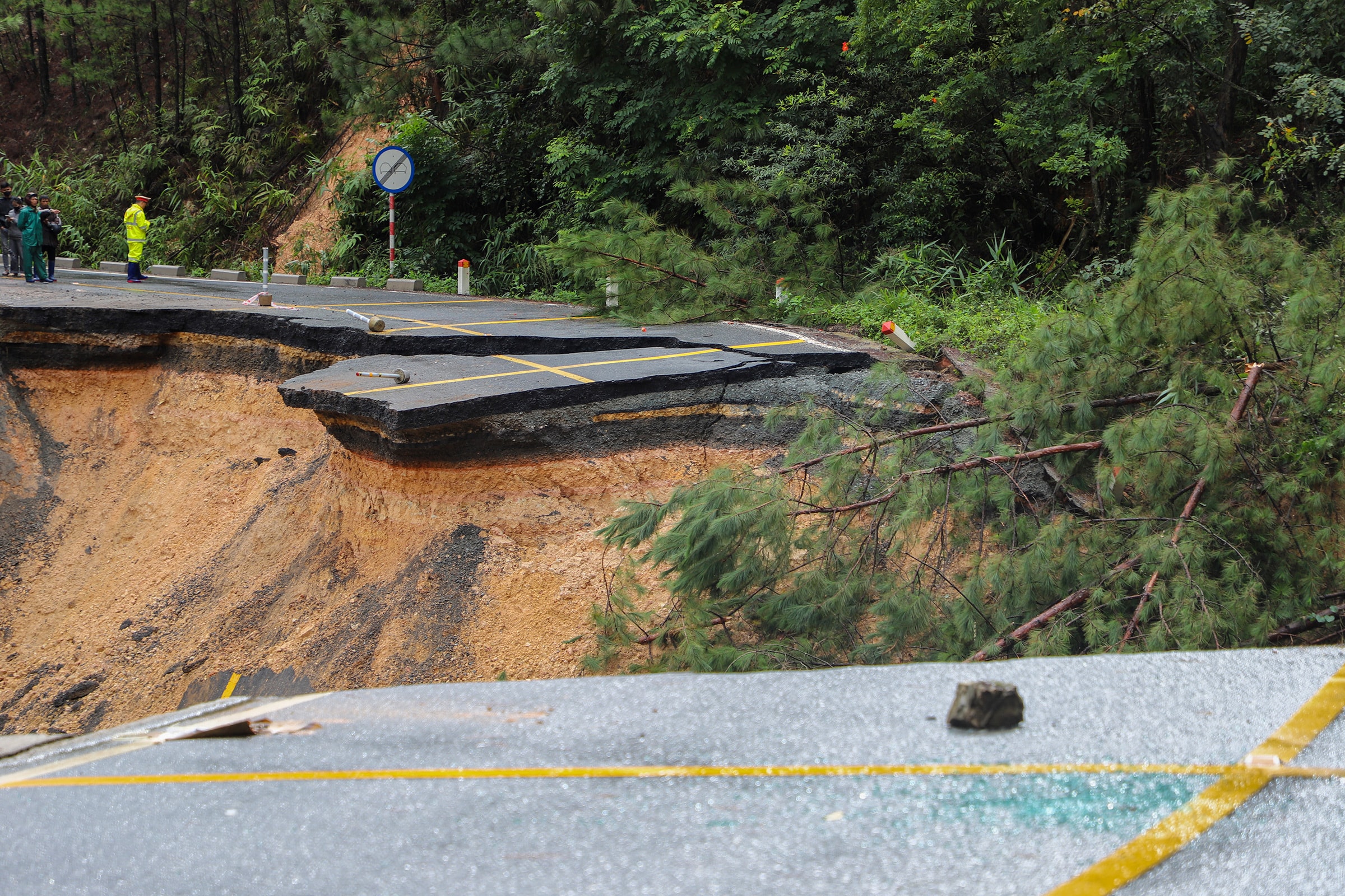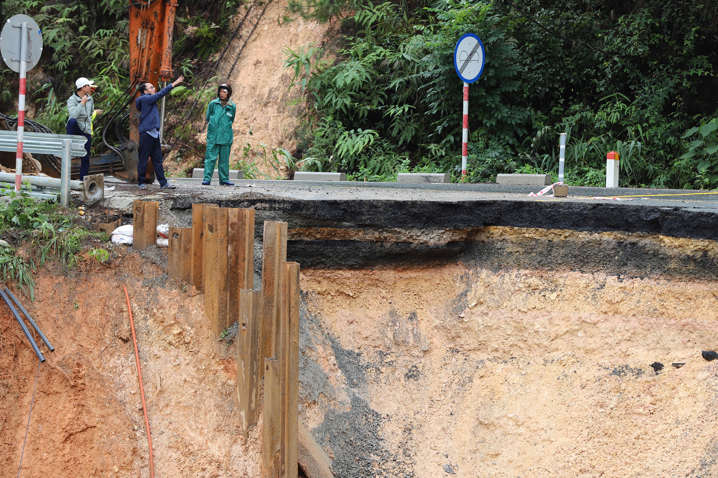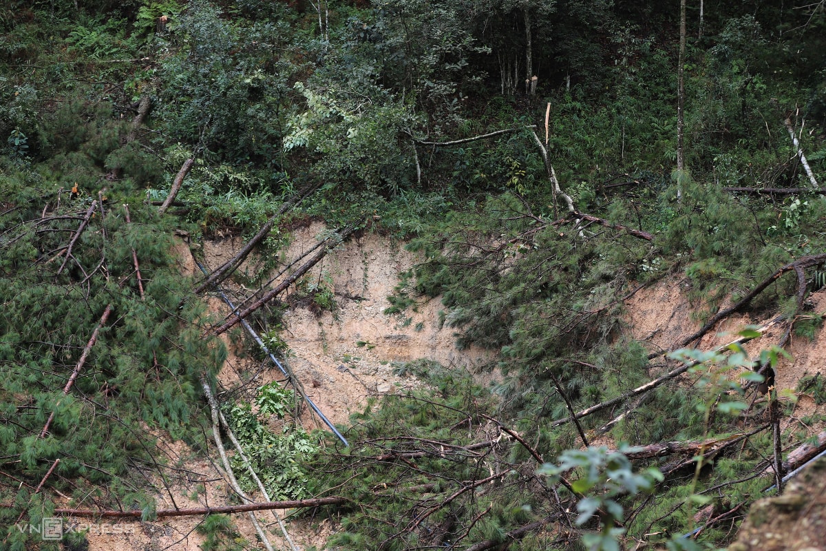 Đèo Mimosa cửa ngõ Đà Lạt bị xé toạc đoạn hơn 50 m, kéo đất đá, cây cối tràn xuống bên dưới và khiến một ôtô khách suýt bị cuốn xuống vực.