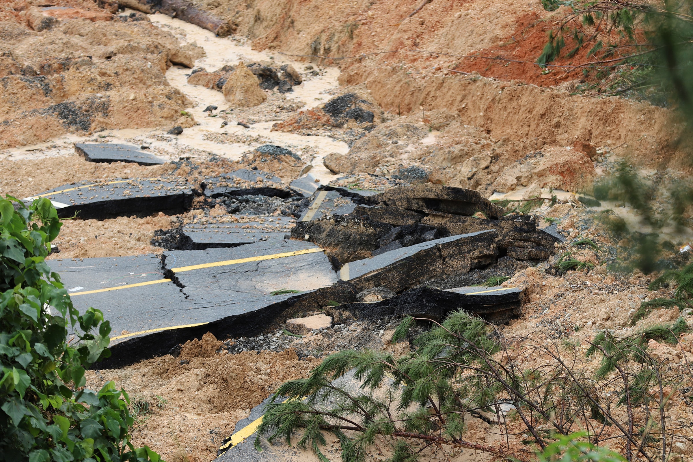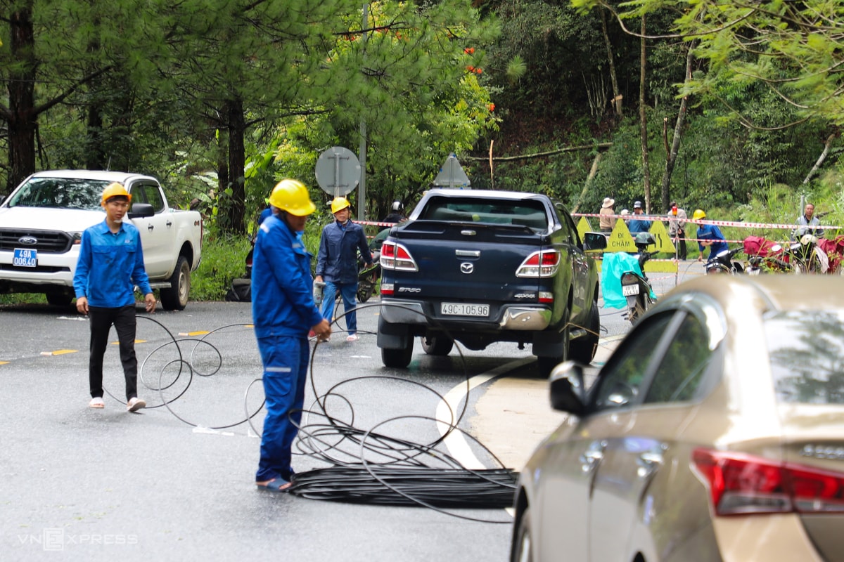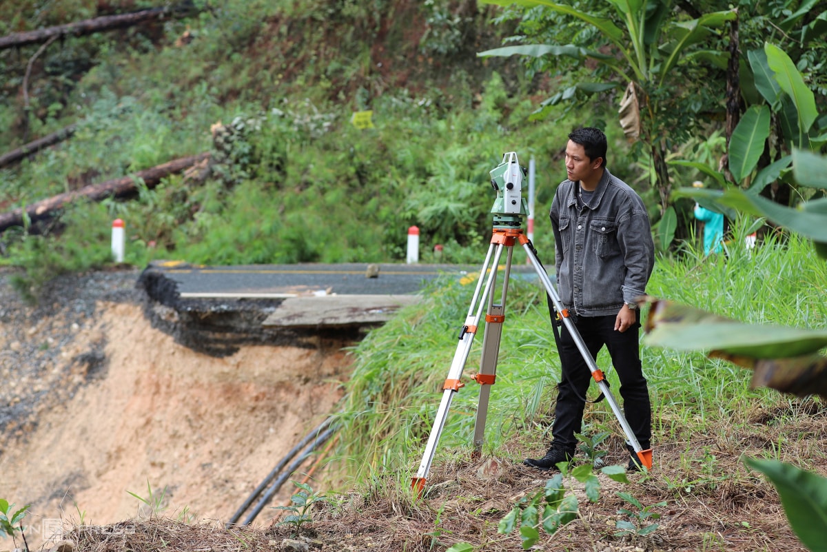 Đèo Mimosa cửa ngõ Đà Lạt bị xé toạc đoạn hơn 50 m, kéo đất đá, cây cối tràn xuống bên dưới và khiến một ôtô khách suýt bị cuốn xuống vực.