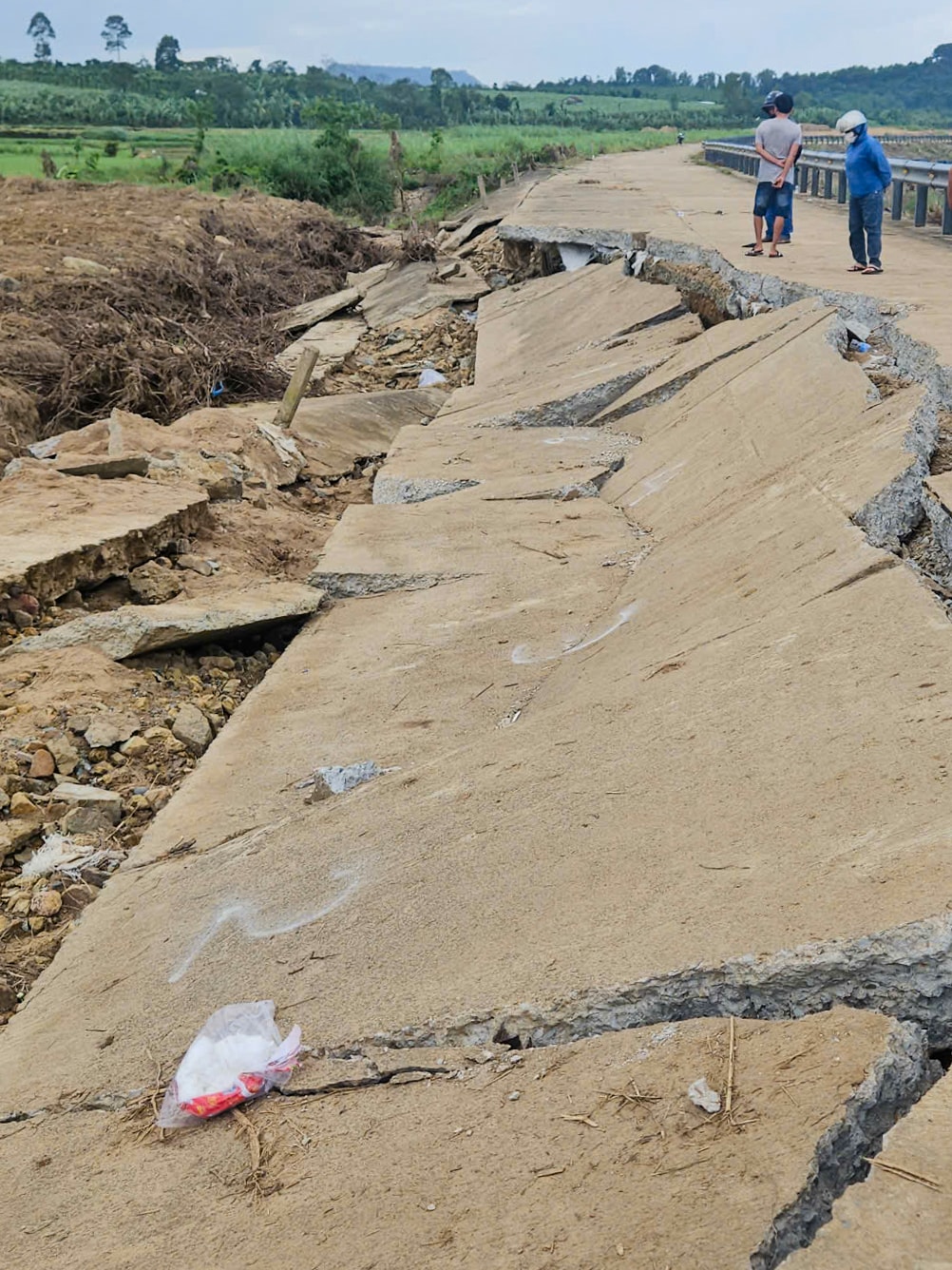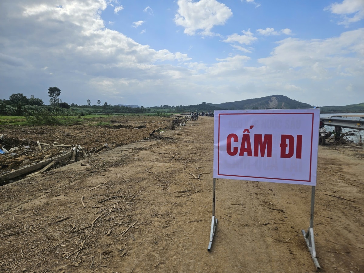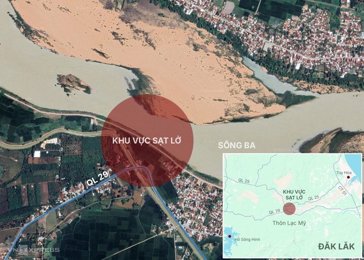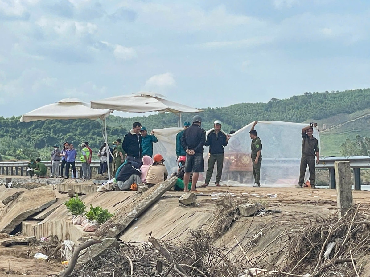 Khu vực bờ kè sông Ba ở thôn Lạc Mỹ, xã Sơn Thành (huyện Tây Hoà, Phú Yên cũ) bị sập dài khoảng 50 m, từng mảng bêtông nứt gãy sau sự cố làm 4 người tử vong.
