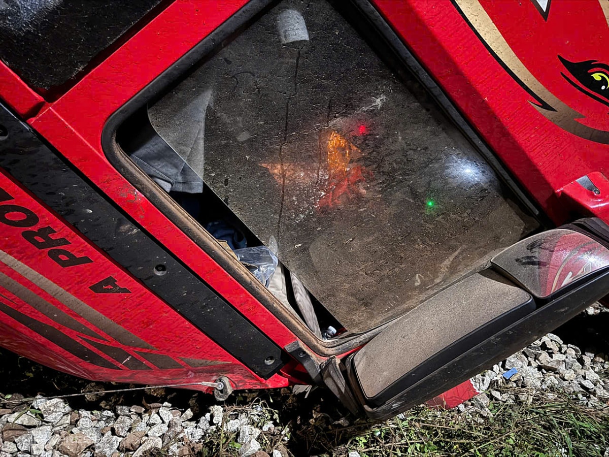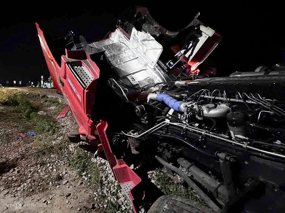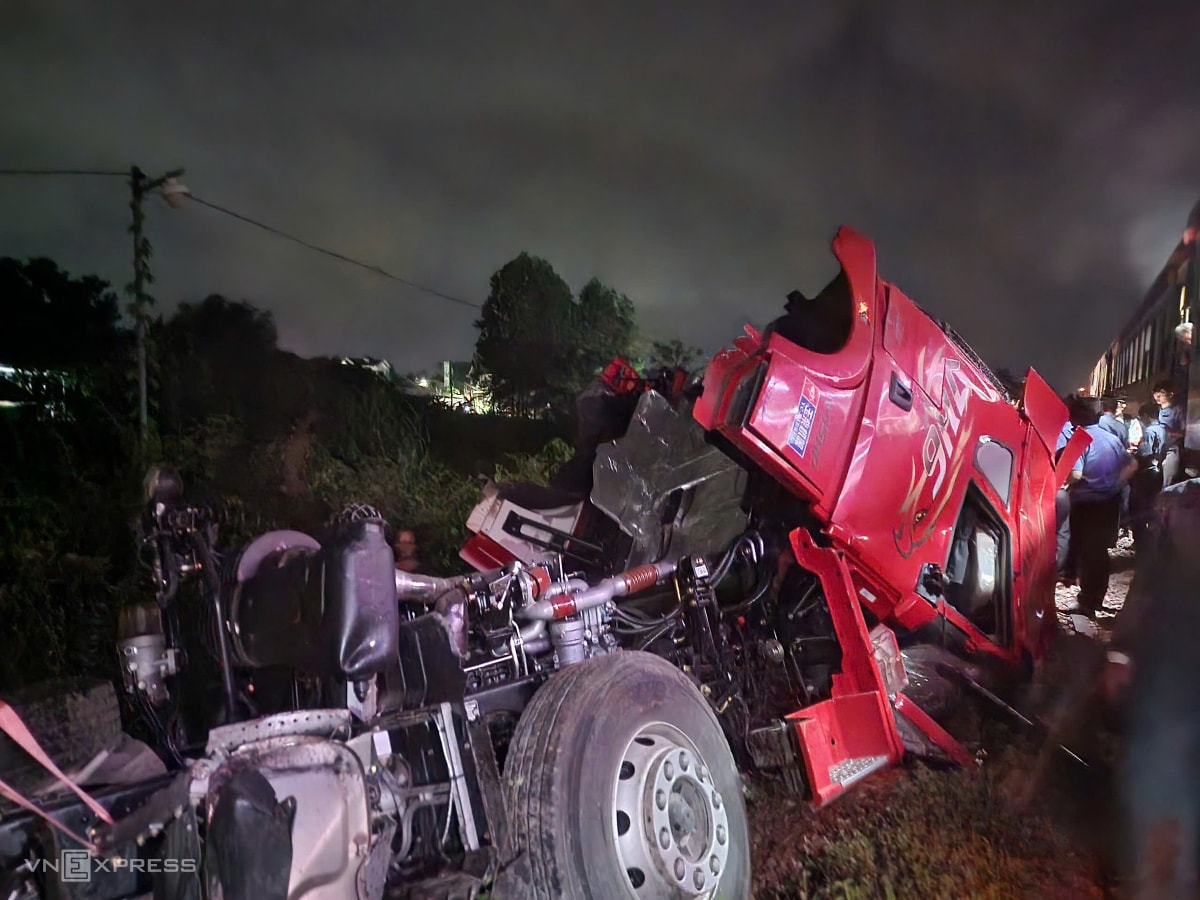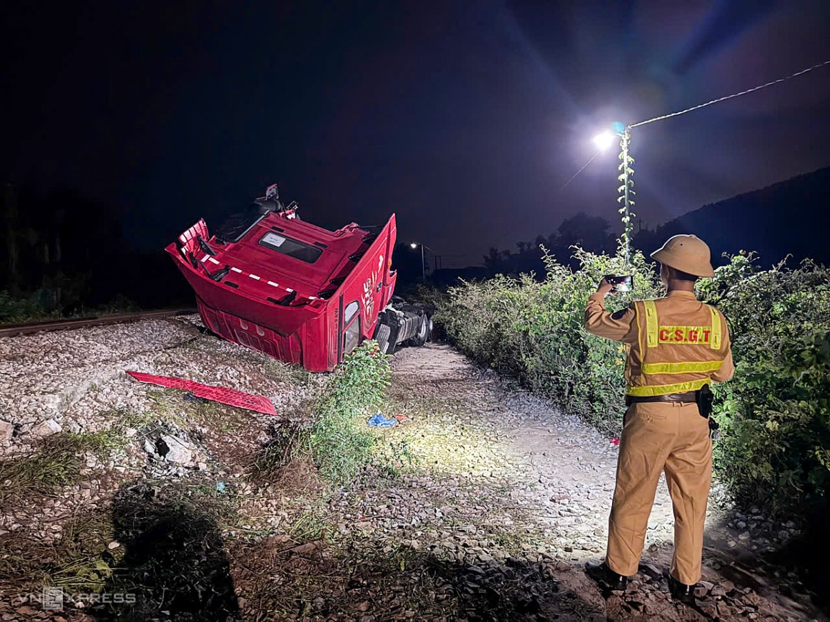 Xe đầu kéo lật ngửa, vỡ đôi, đầu máy tàu SE8 móp méo sau cú va chạm tại xã Vệ Giang tối 6/3, khiến hai tài xế bị thương.