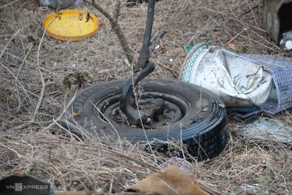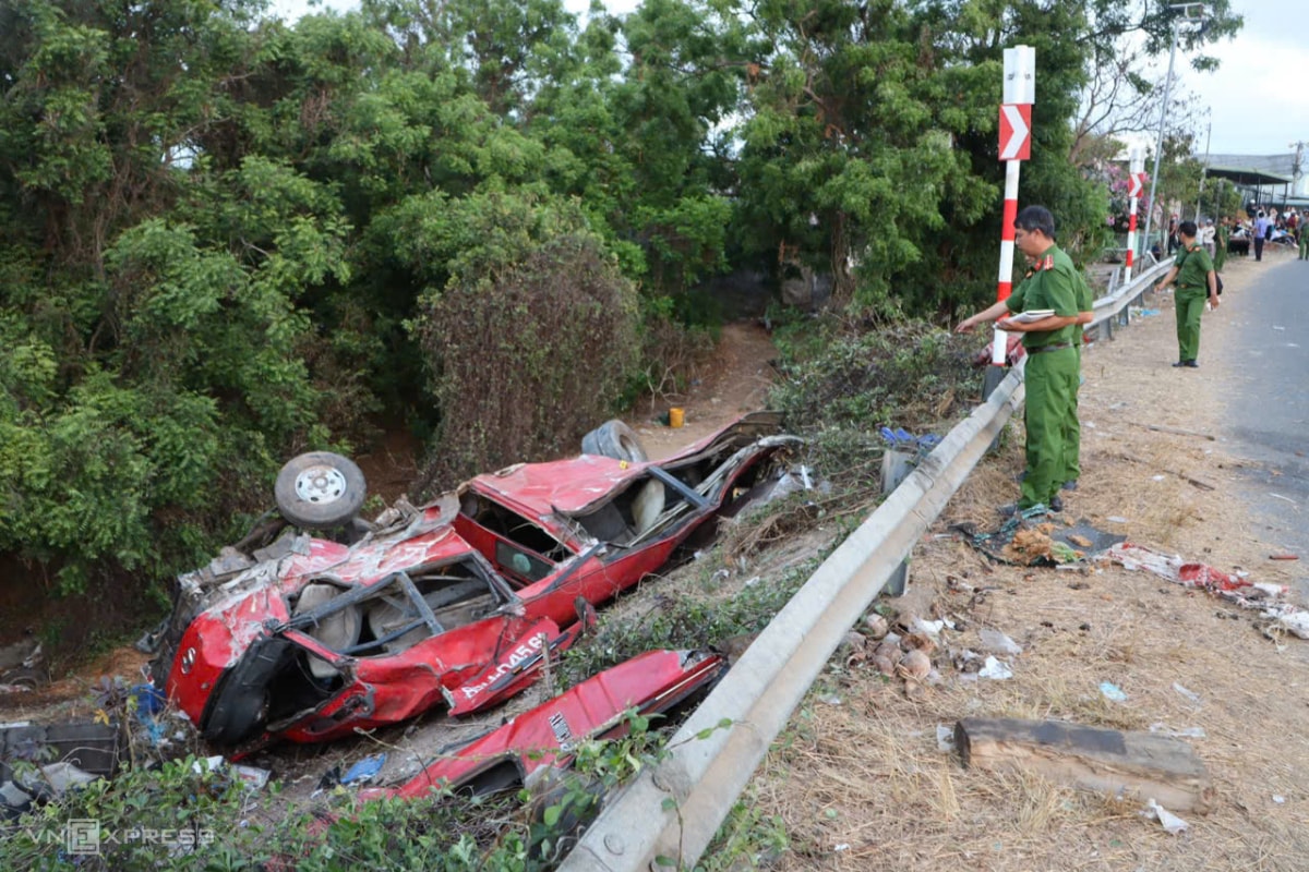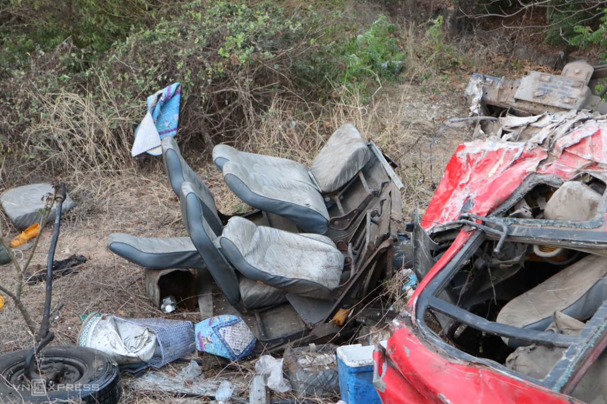 Đầu và thân xe khách bẹp dúm, vỡ nhiều mảnh sau khi lao xuống vực gần hồ Bàu Trắng, khiến 4 thợ lặn tử vong, 10 người bị thương.