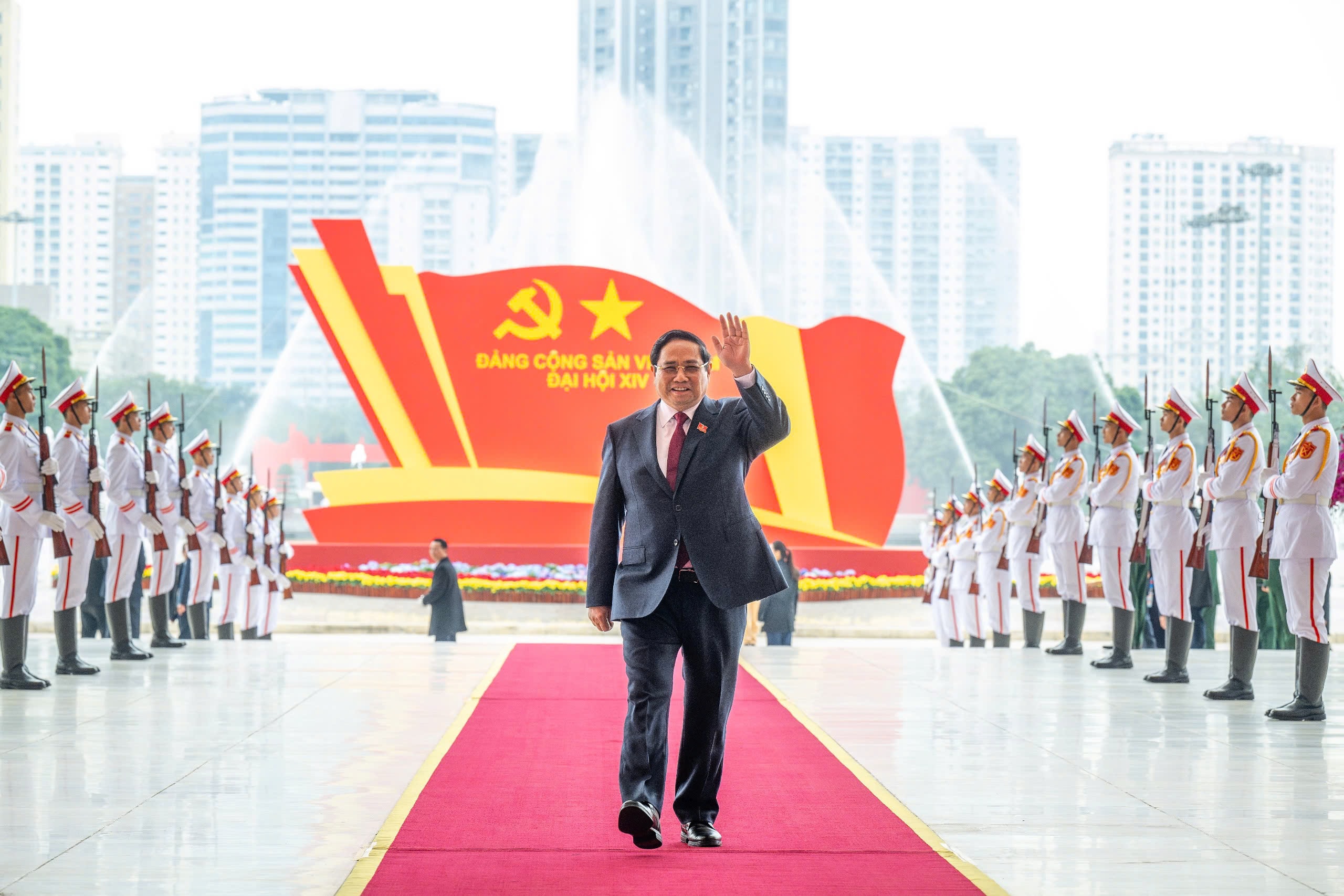 Từ trái qua là Chủ tịch nước Lương Cường; Thủ tướng Phạm Minh Chính; Chủ tịch Quốc hội Trần Thanh Mẫn, đến dự Đại hội Đảng XIV.
