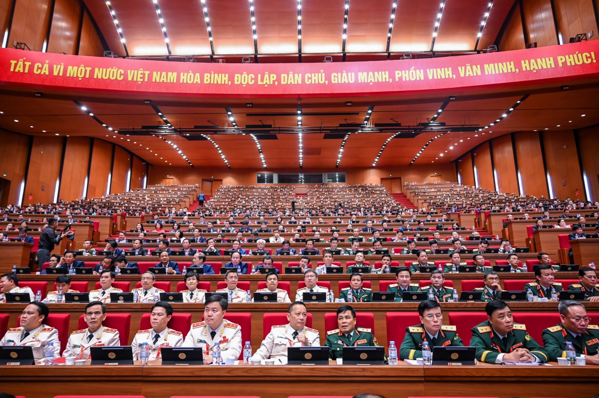 Tổng Bí thư Tô Lâm cùng lãnh đạo Đảng, Nhà nước giơ thẻ đảng biểu quyết tại Đại hội Đảng XIV.