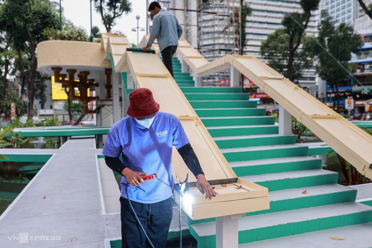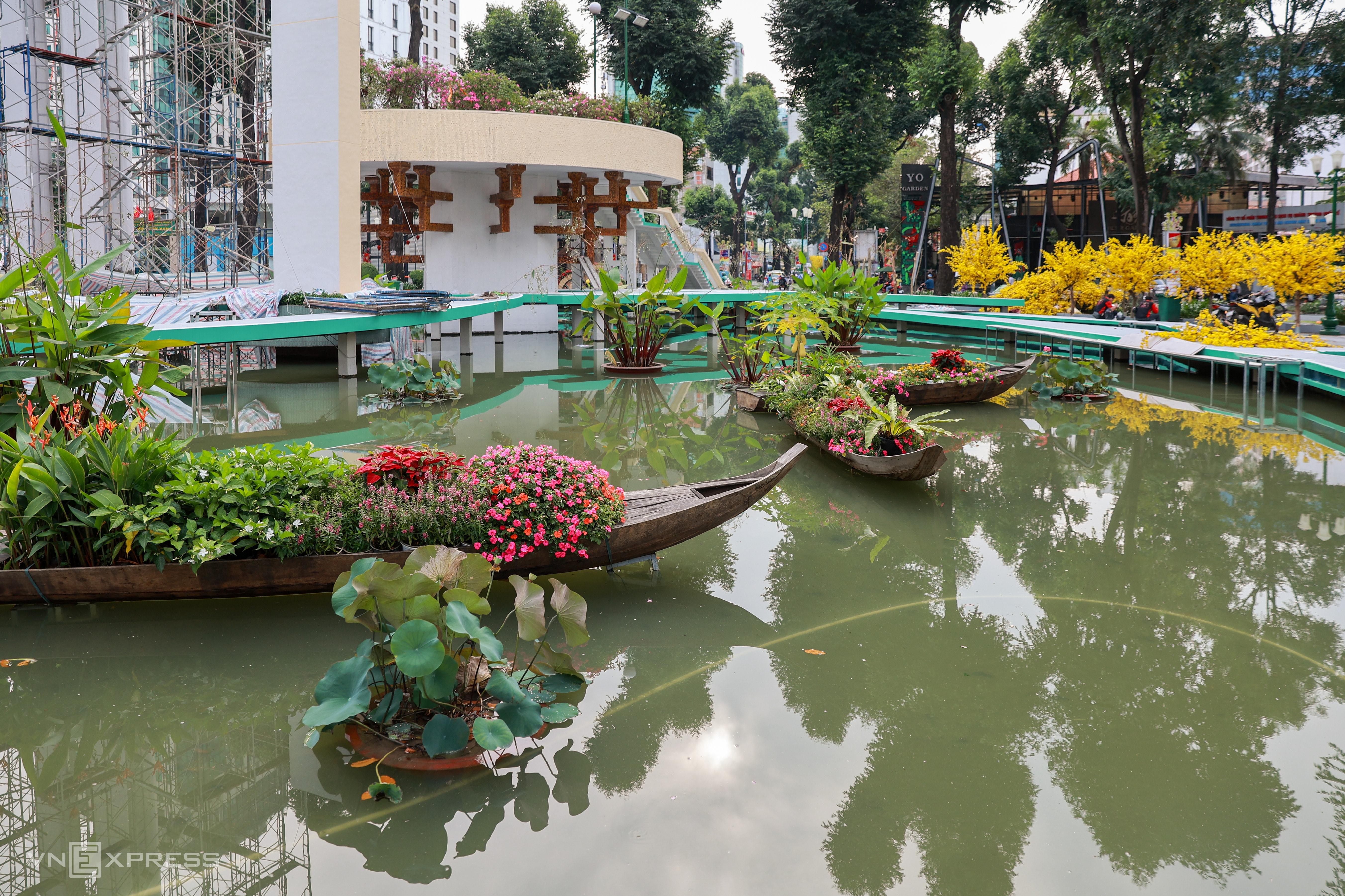Các lối đi quanh hồ nước được làm sạch rêu mốc, sơn màu xanh và trắng. Hồ nước được trang trí thêm cây kiểng mới, thuyền hoa và tiểu cảnh xuân xung quanh.