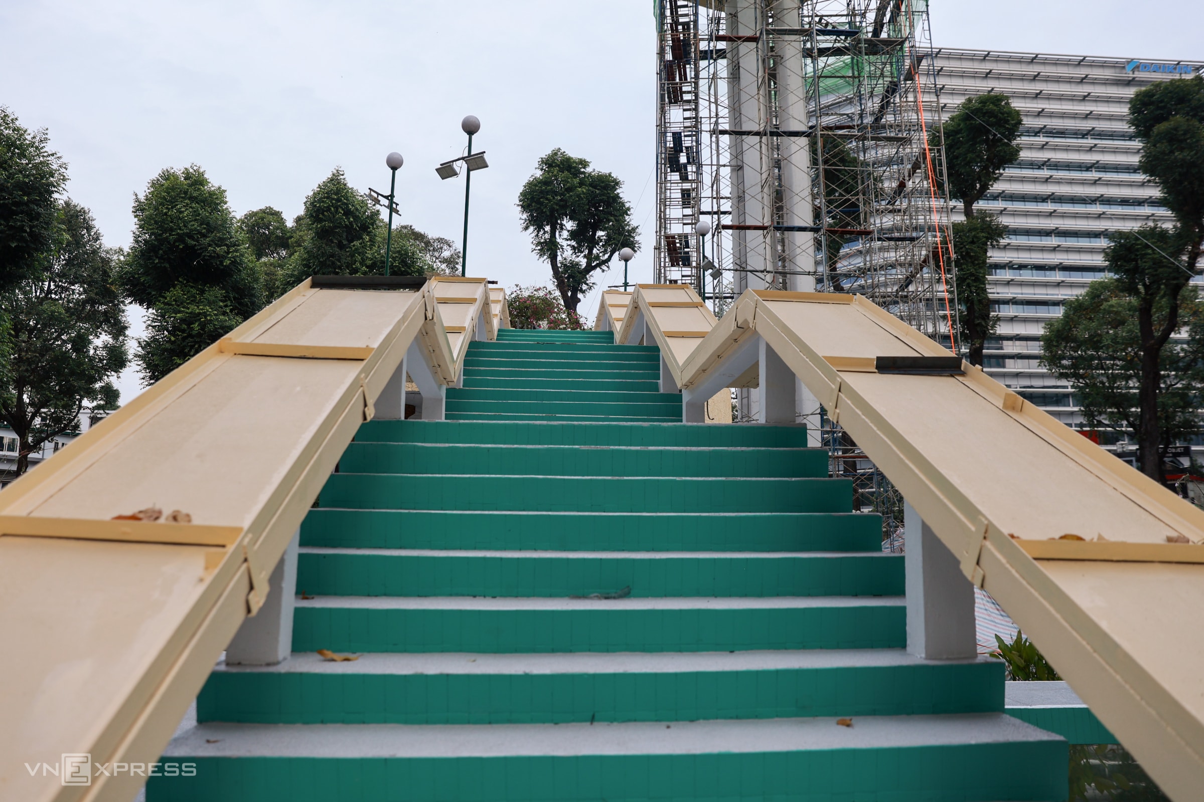 Cầu thang được sơn màu xanh trên các bậc, vàng ở lan can. Phần trụ cột cũng có màu sắc đồng nhất, đang chờ tháo giàn giáo.