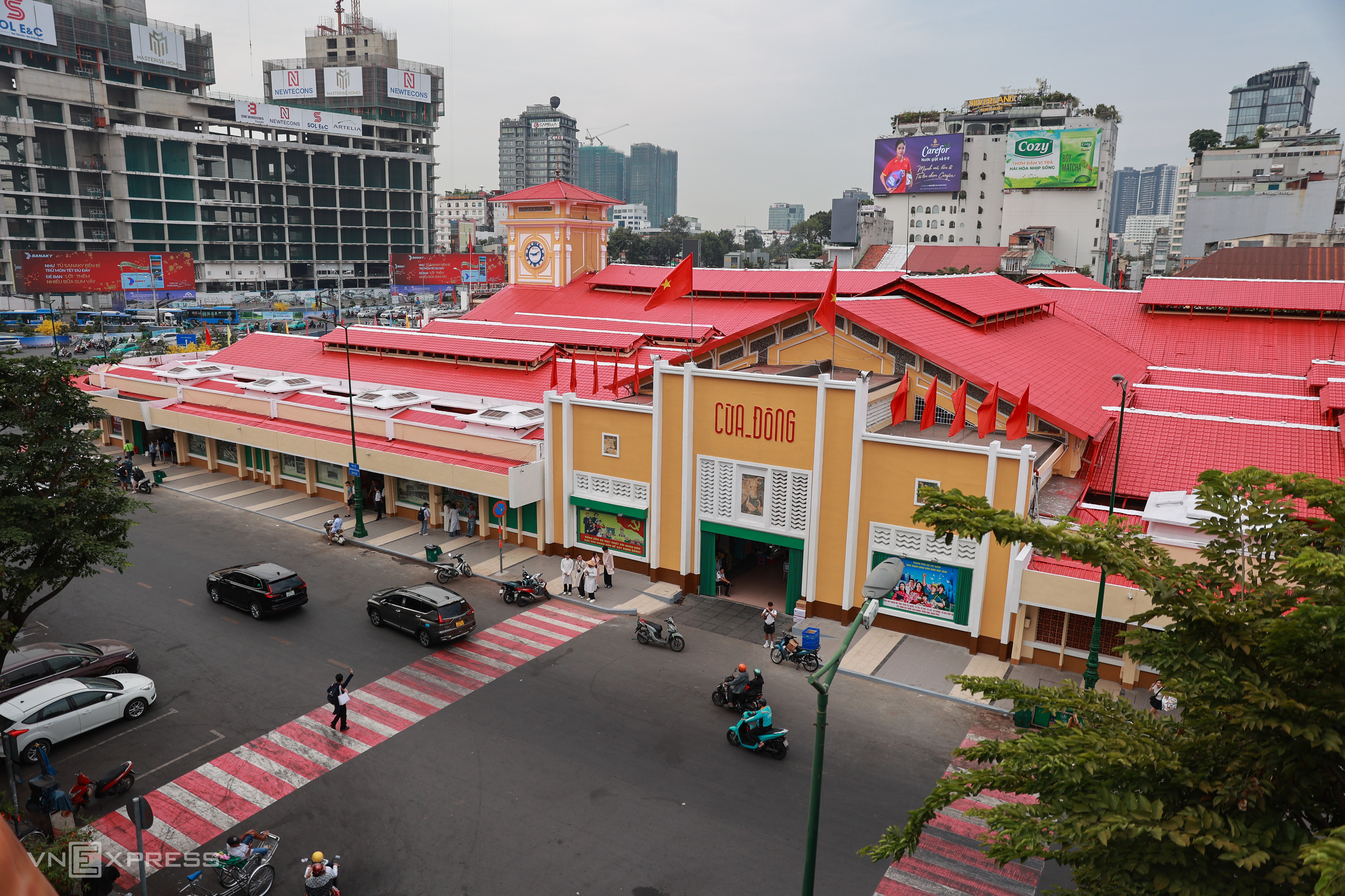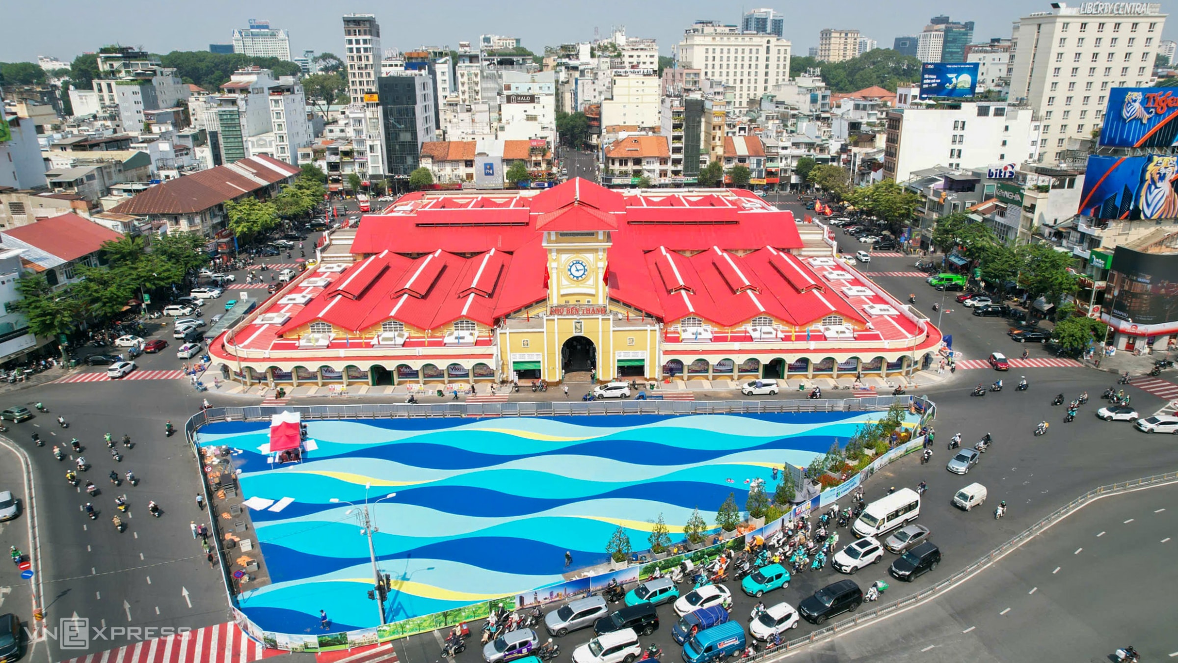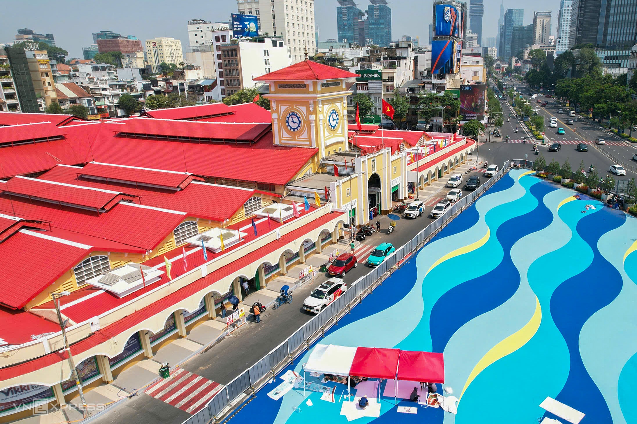 Cách đó khoảng 1,5 km, chợ Bến Thành cũng mang diện mạo mới so với trước sau chỉnh trang. Chợ được sơn mới tường, mái nhưng vẫn giữ nguyên các đường nét, họa tiết trang trí. Quảng trường phía trước chợ được sơn các mảng họa tiết lớn hình sóng nước với nhiều gam màu.