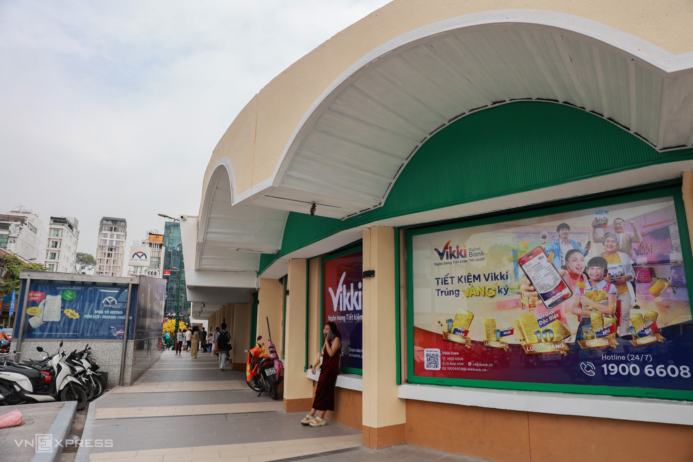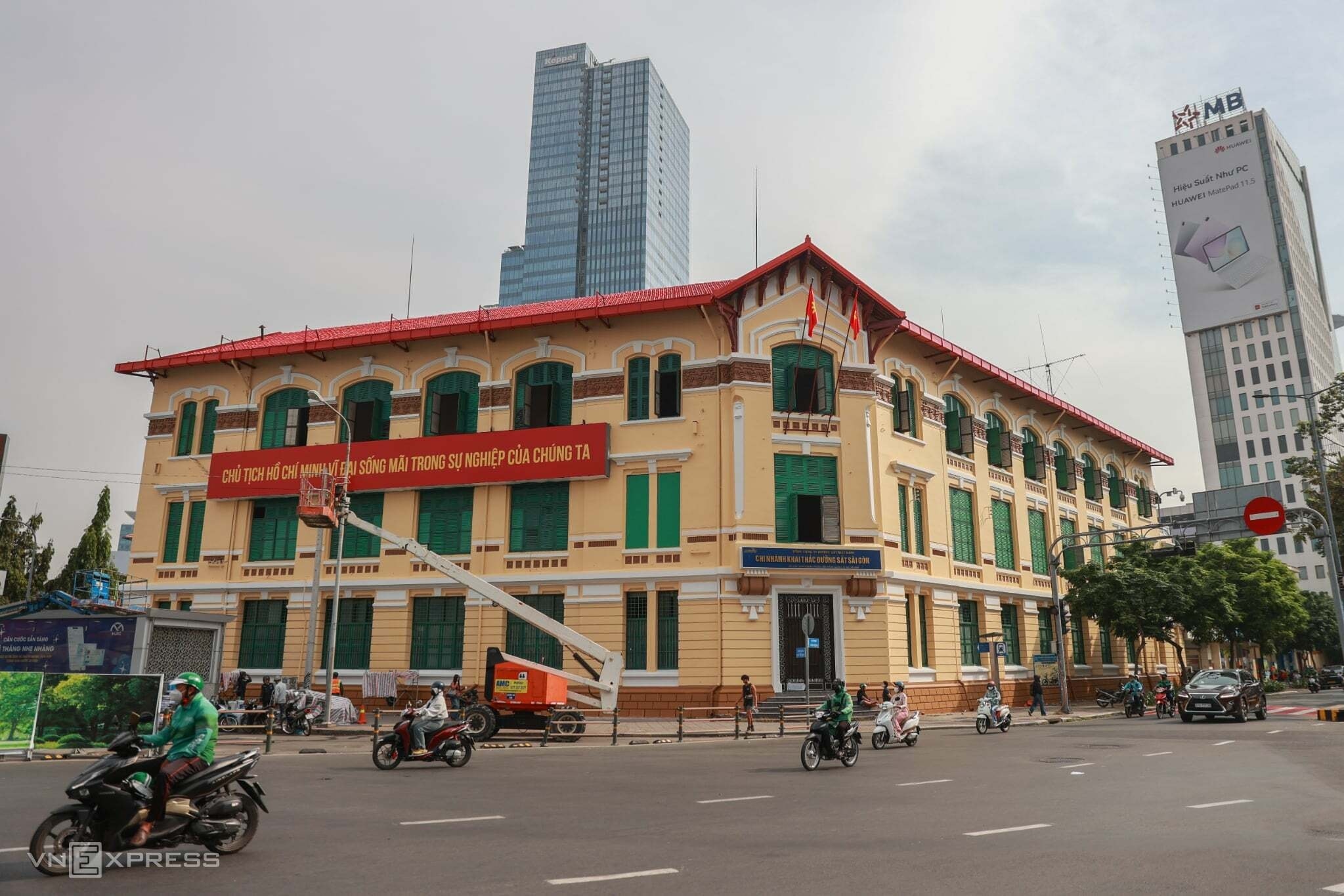 Phía trước chợ là trụ sở Công ty cổ phần Vận tải đường sắt Sài Gòn, 136 Hàm Nghi, được làm mới với mái đỏ, tường màu vàng đậm hơn so với trước. Công trình có hơn 110 năm tuổi, kiến trúc Pháp, từng là trụ sở của Công ty Hỏa xa Đông Dương, nên gọi là tòa nhà Hỏa xa.