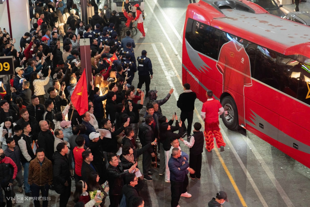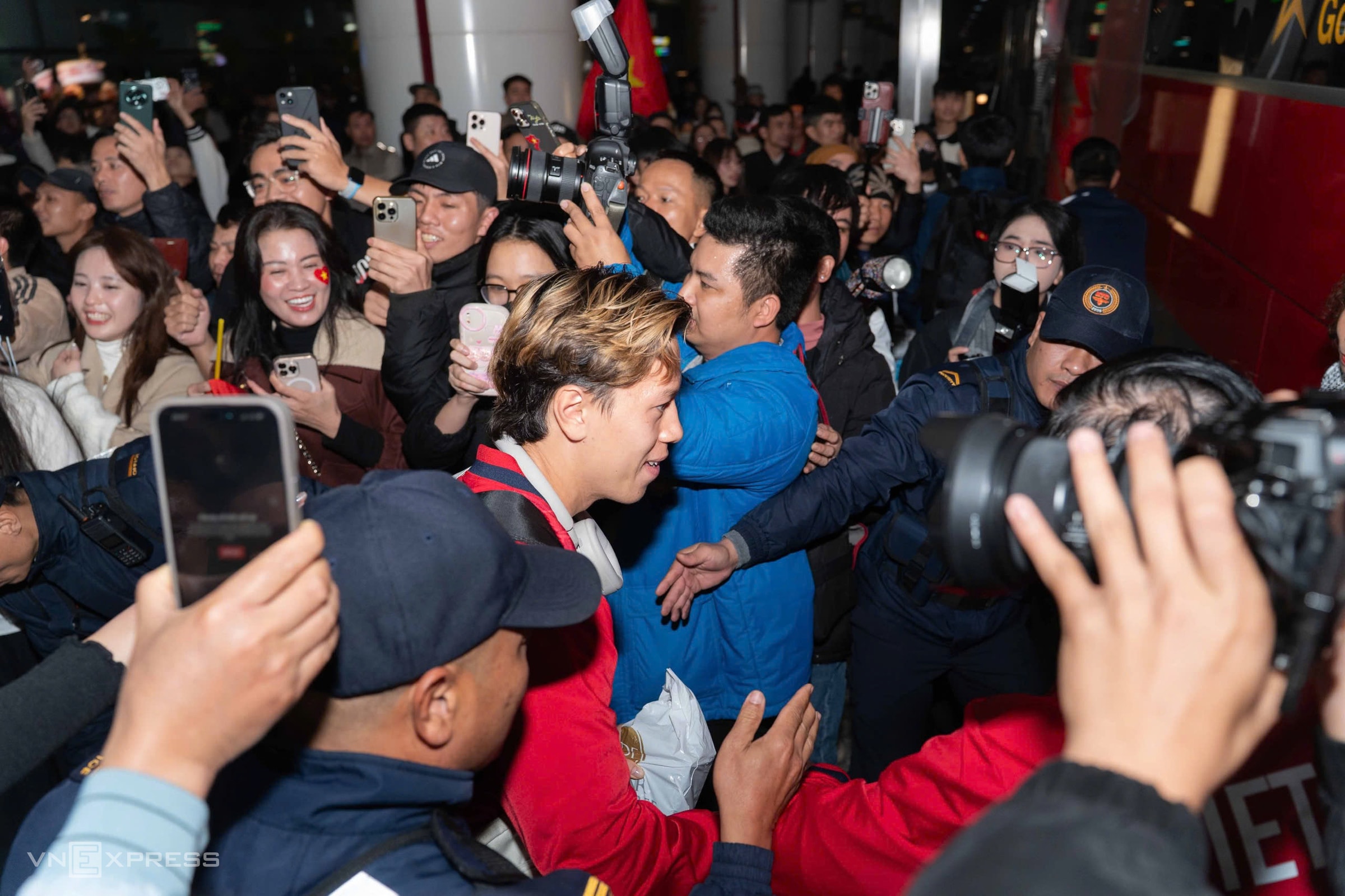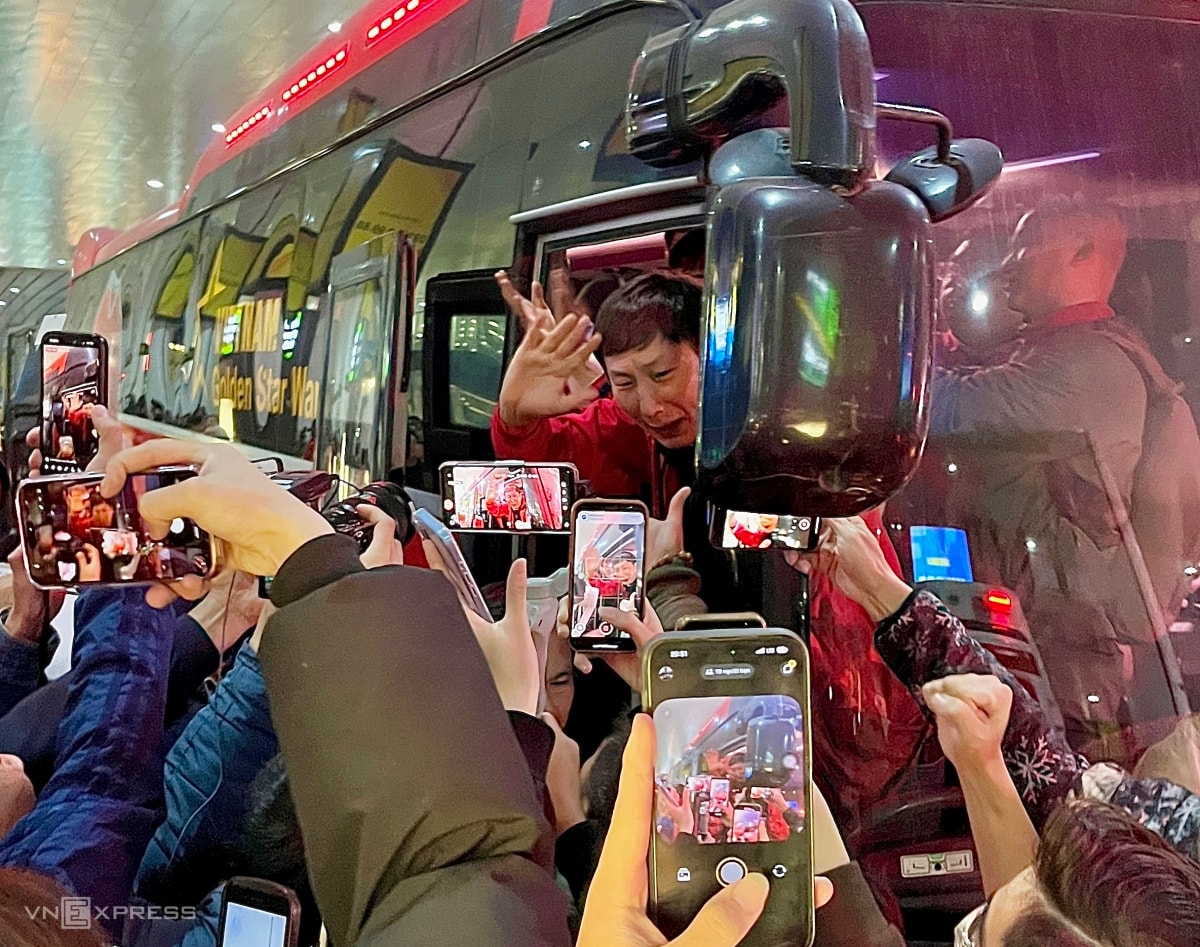 Các cầu thủ Việt Nam đi giữa người hâm mộ trong niềm hạnh phúc. Tiền đạo Nguyễn Quốc Việt lấy điện thoại quay lại cảnh tượng có thể là để đời.