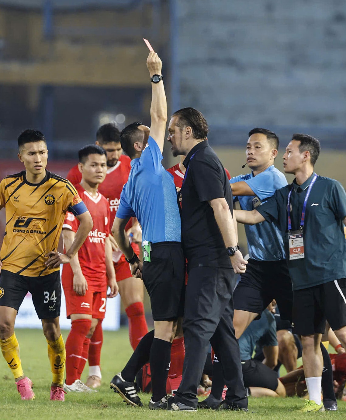 Ở phút bù thứ 5 hiệp hai, hậu vệ Trương Thanh Nam của Thanh Hóa xoạc bóng quyết liệt với Wesley Nata ở sát khu kỹ thuật Thể Công. Trọng tài Nguyễn Viết Duẩn rút thẻ vàng, nhưng các thành viên chủ nhà cho rằng phải là thẻ đỏ.