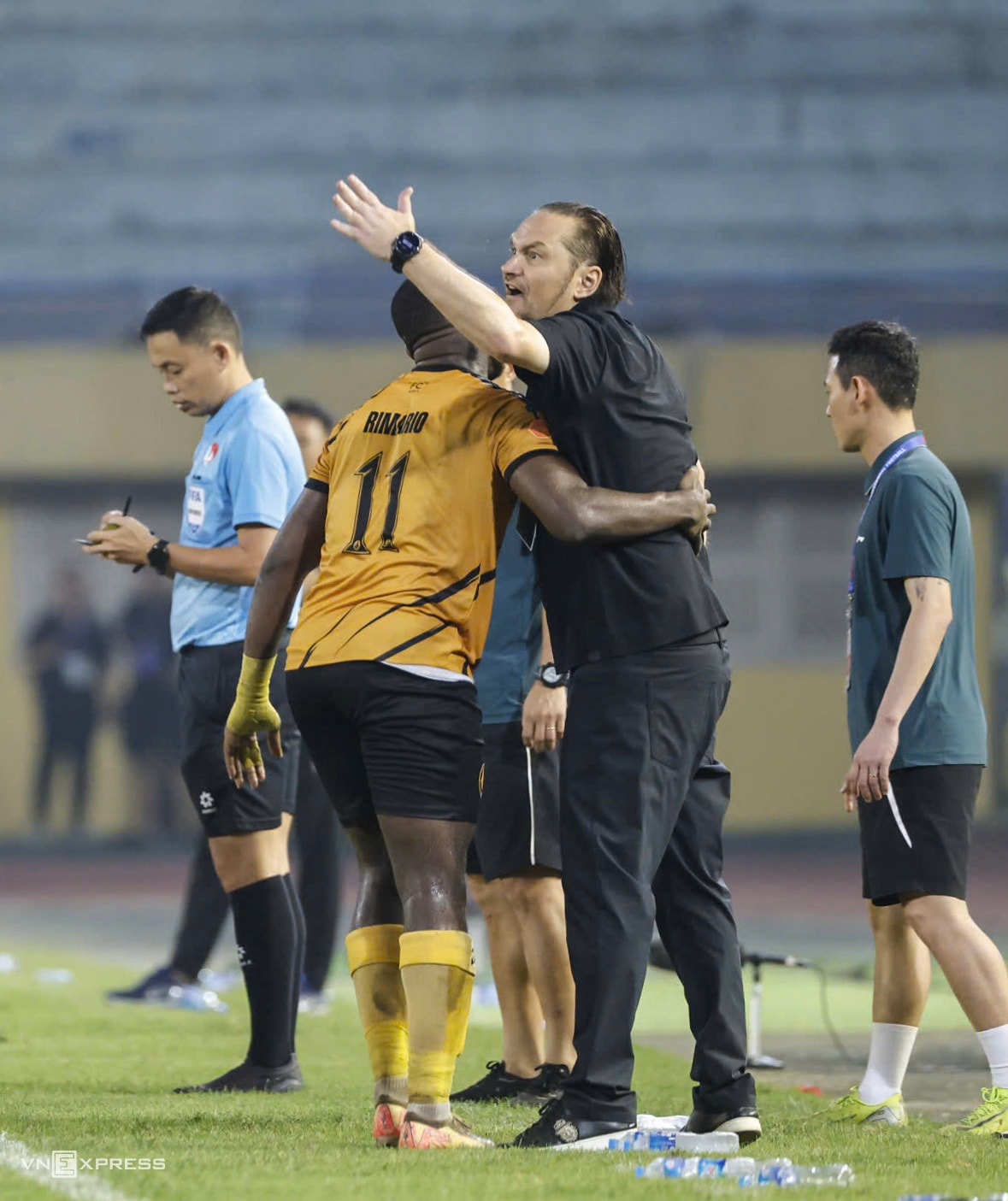 Đội trưởng Doãn Ngọc Tân rồi Rimario (số 11) - những học trò cũ tại CLB Thanh Hóa - lần lượt chạy tới xoa dịu HLV Popov. Rimario thậm chí ôm chặt và nói chuyện, nhưng vẫn không thể hạ nhiệt cái đầu nóng của nhà cầm quân Bulgaria.