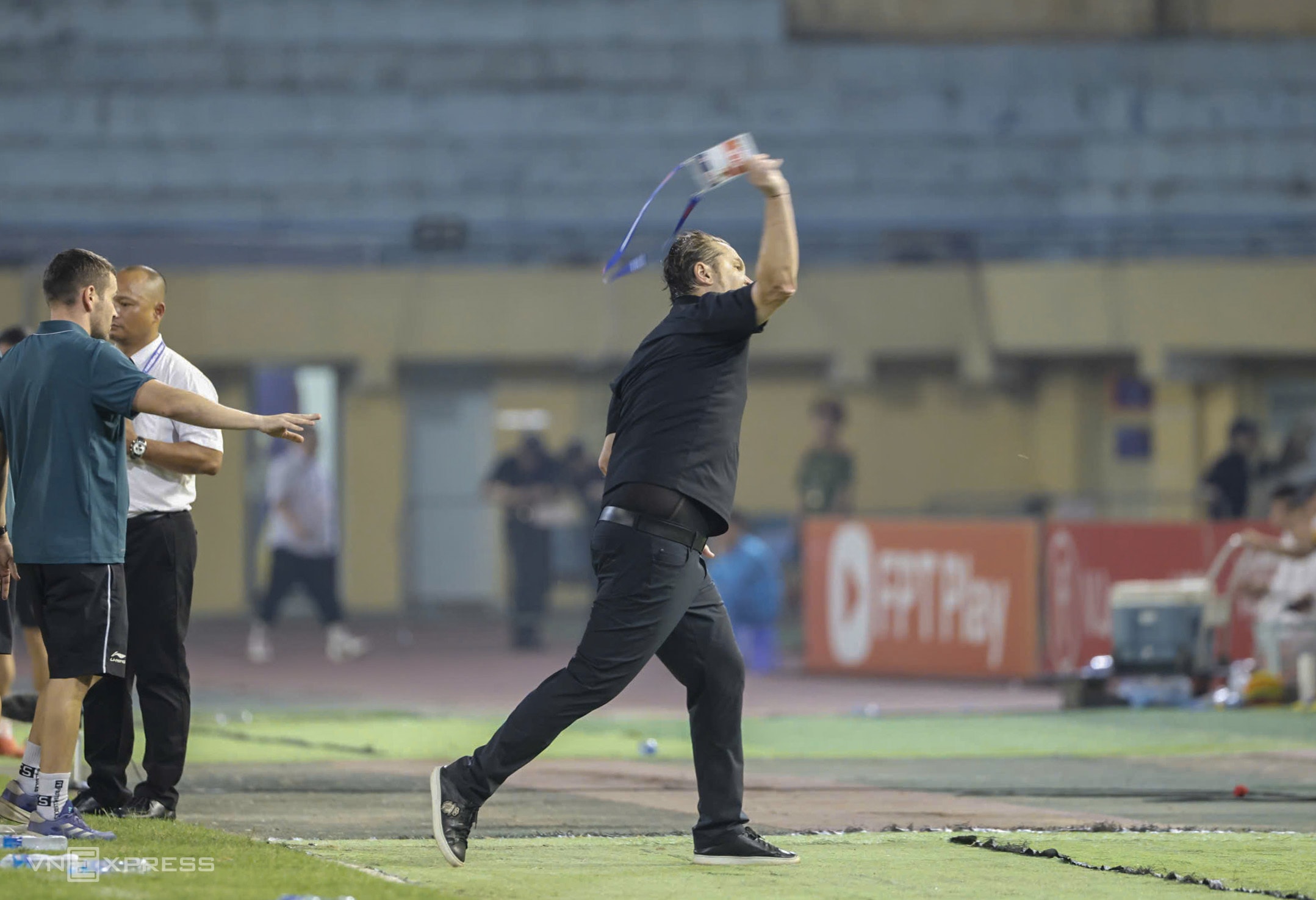 Sau khi được can ngăn, nhà cầm quân sinh năm 1976 giật phắt thẻ HLV rồi ném mạnh về phía khu kỹ thuật. Ông vẫn ngồi ở ghế và chỉ di chuyển vào phòng thay đồ khi bị trọng tài chính nhắc nhở lần thứ hai.