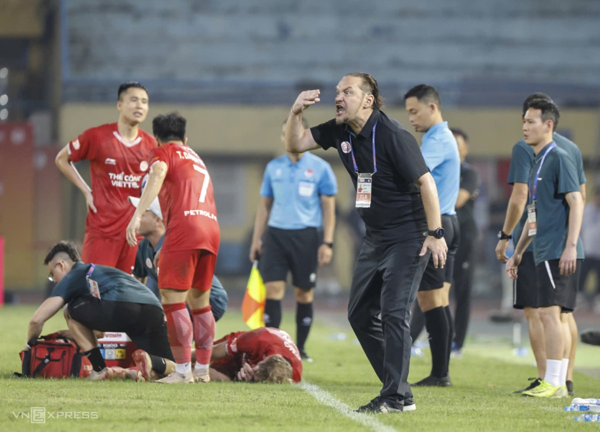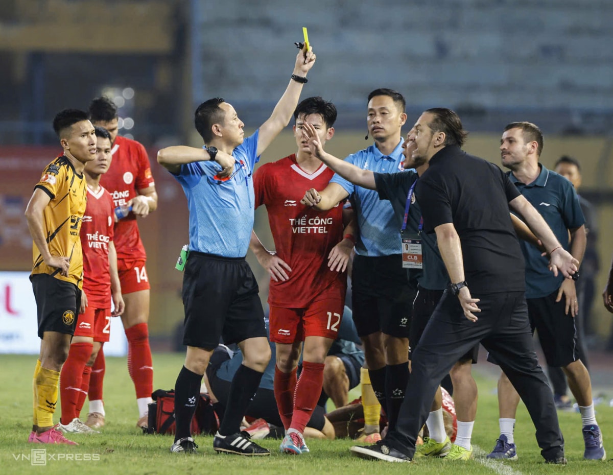 Một vài cầu thủ Thể Công bất mãn rồi lời qua tiếng lại với Thanh Nam. Trong khi đó, HLV Velizar Popov (áo đen) liên tục vung tay, gào thét dữ dội về phía trọng tài Duẩn.