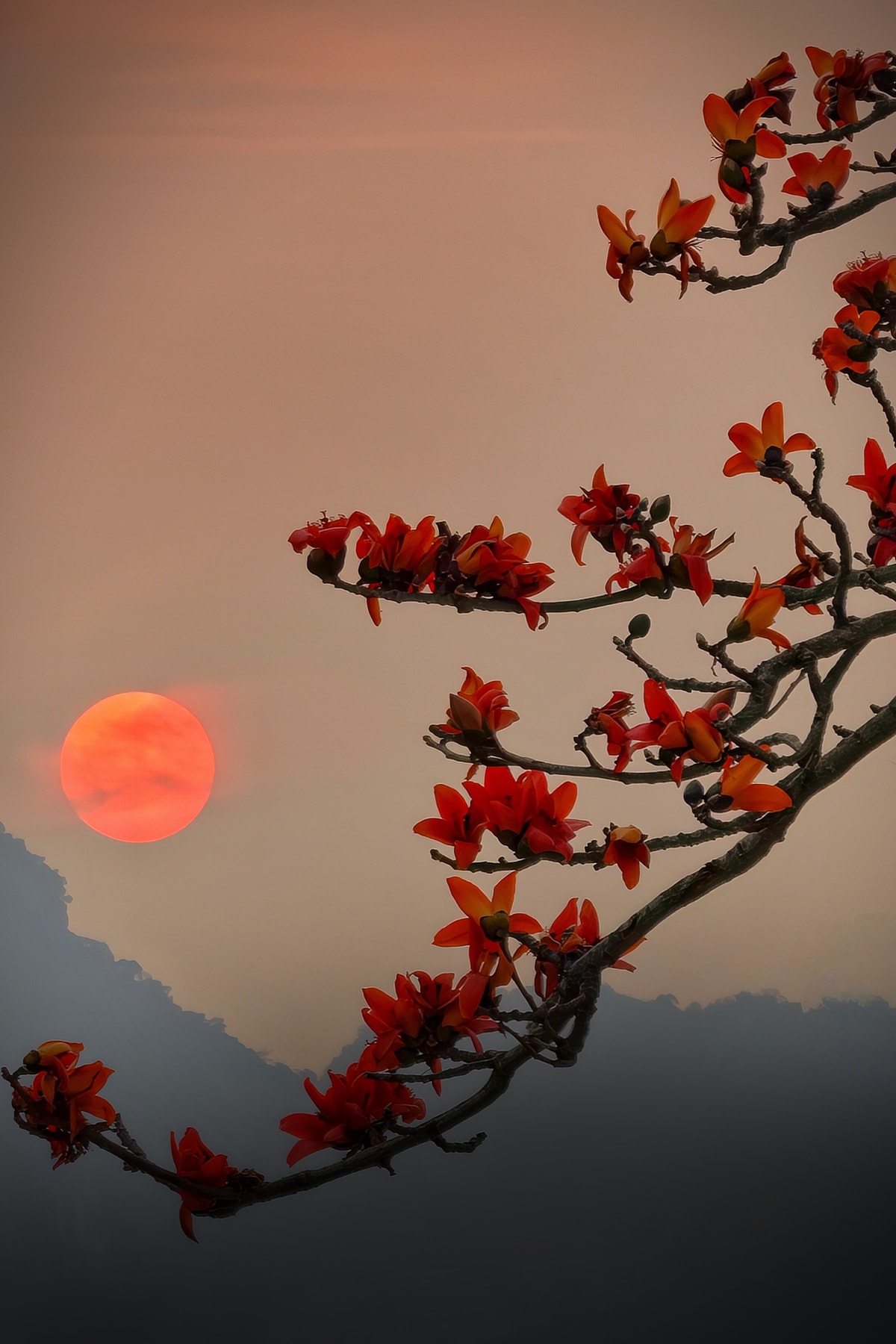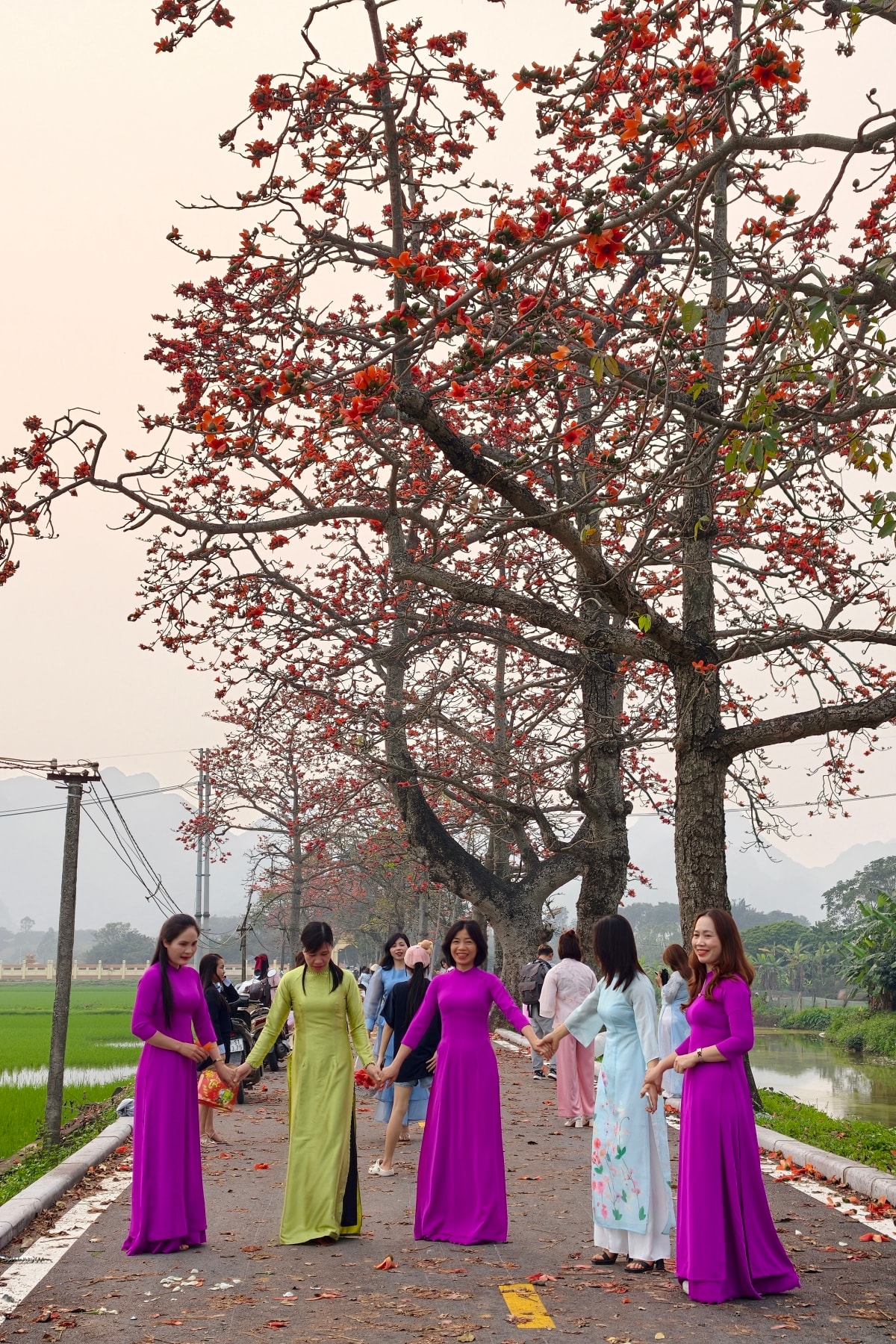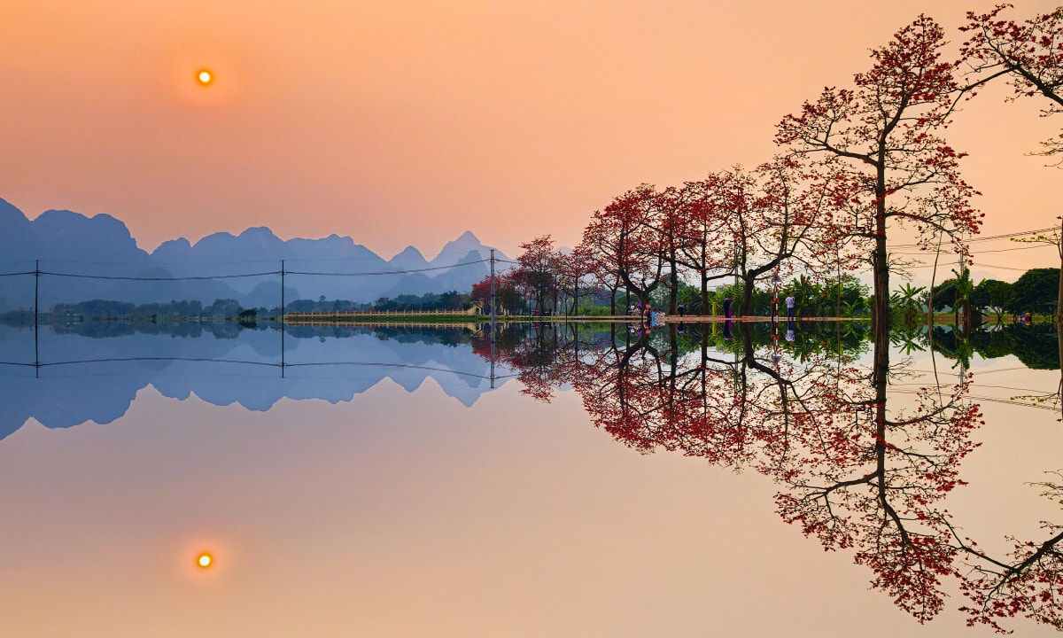 Nằm bên dòng sông Đáy, hàng hoa gạo cổ thụ thôn Đoan Nữ, xã Mỹ Đức, Hà Nội, trút lá, nở hoa đỏ rực, đánh dấu sự chuyển giao thời tiết và khởi đầu mùa vụ mới.