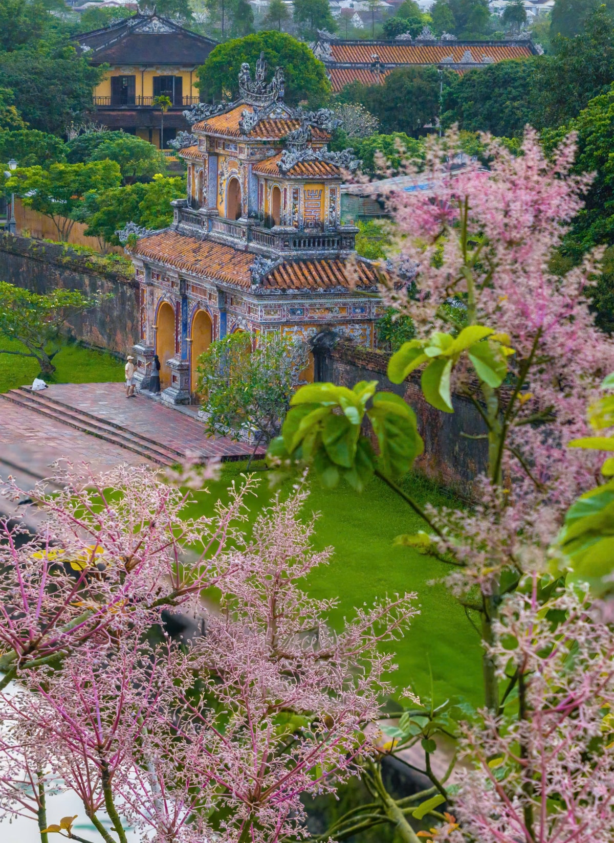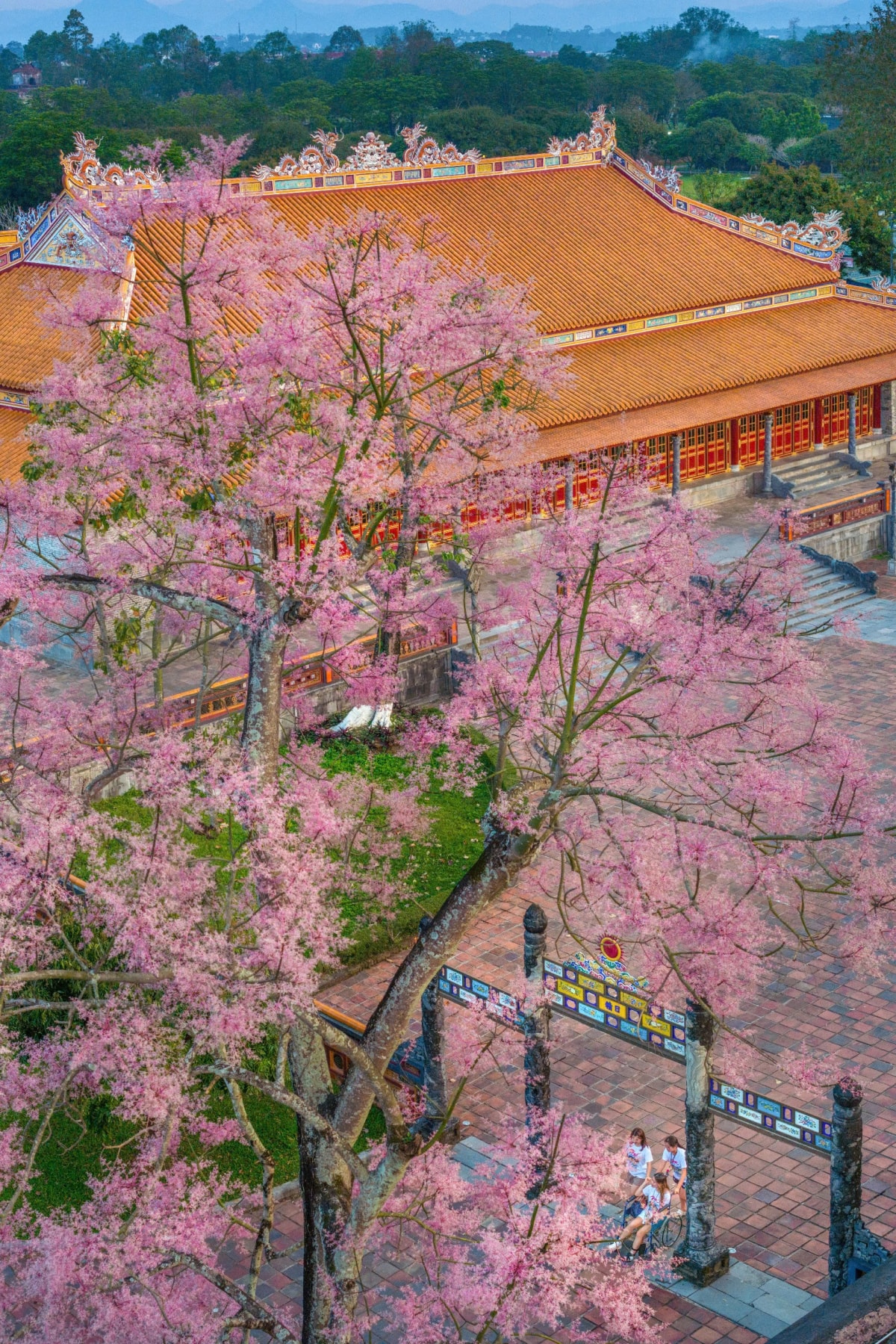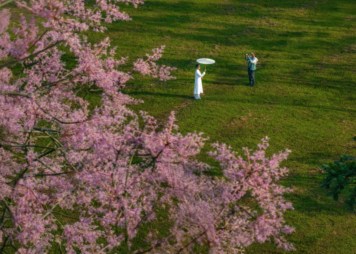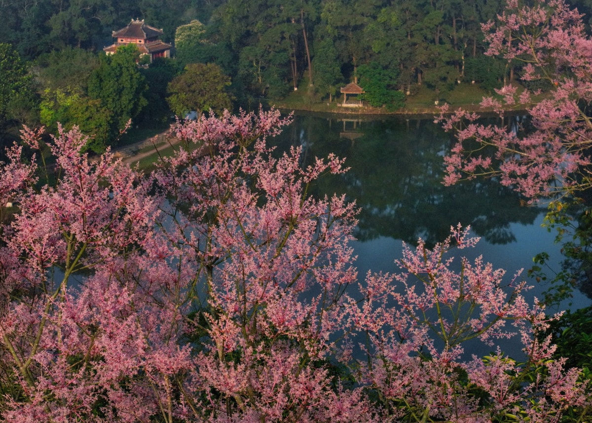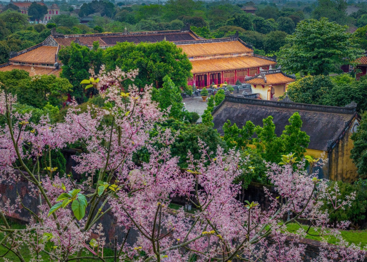 Hoa ngô đồng nở rộ trong Hoàng cung, nhuộm sắc hồng tím trên nền cổ kính của các công trình di tích những ngày cuối tháng 3.