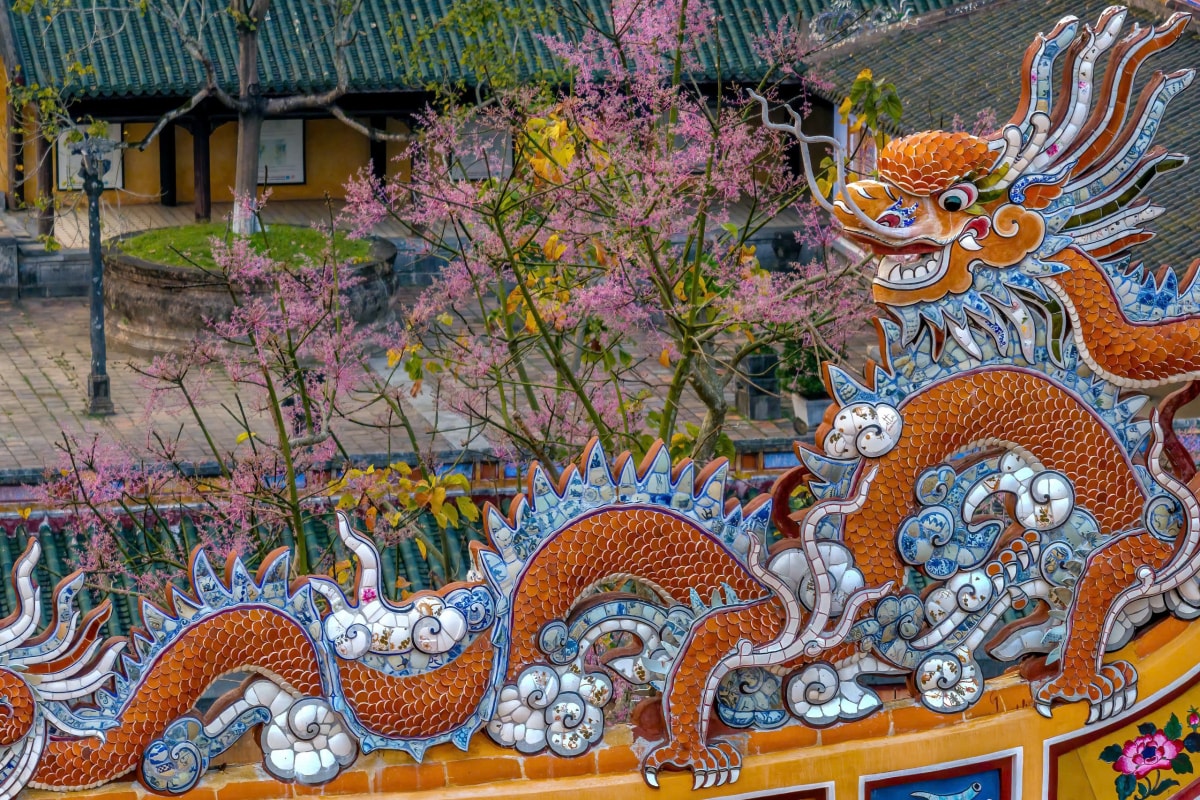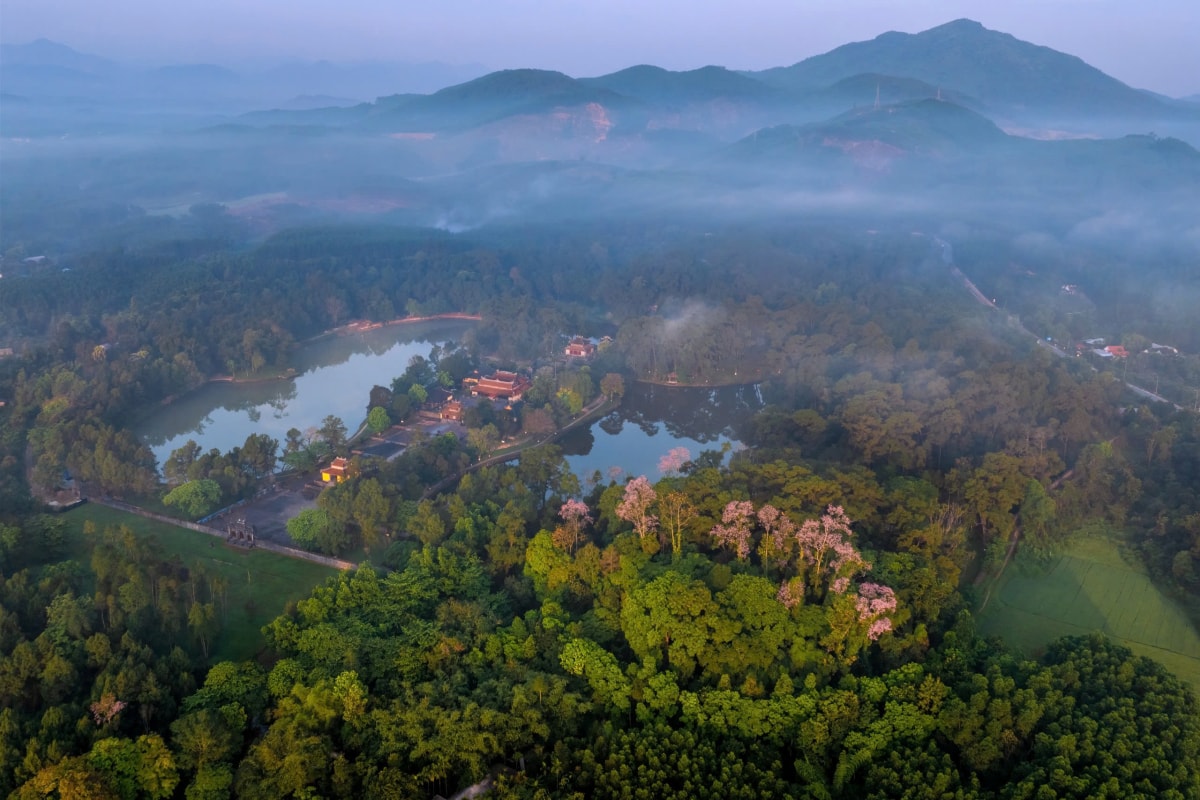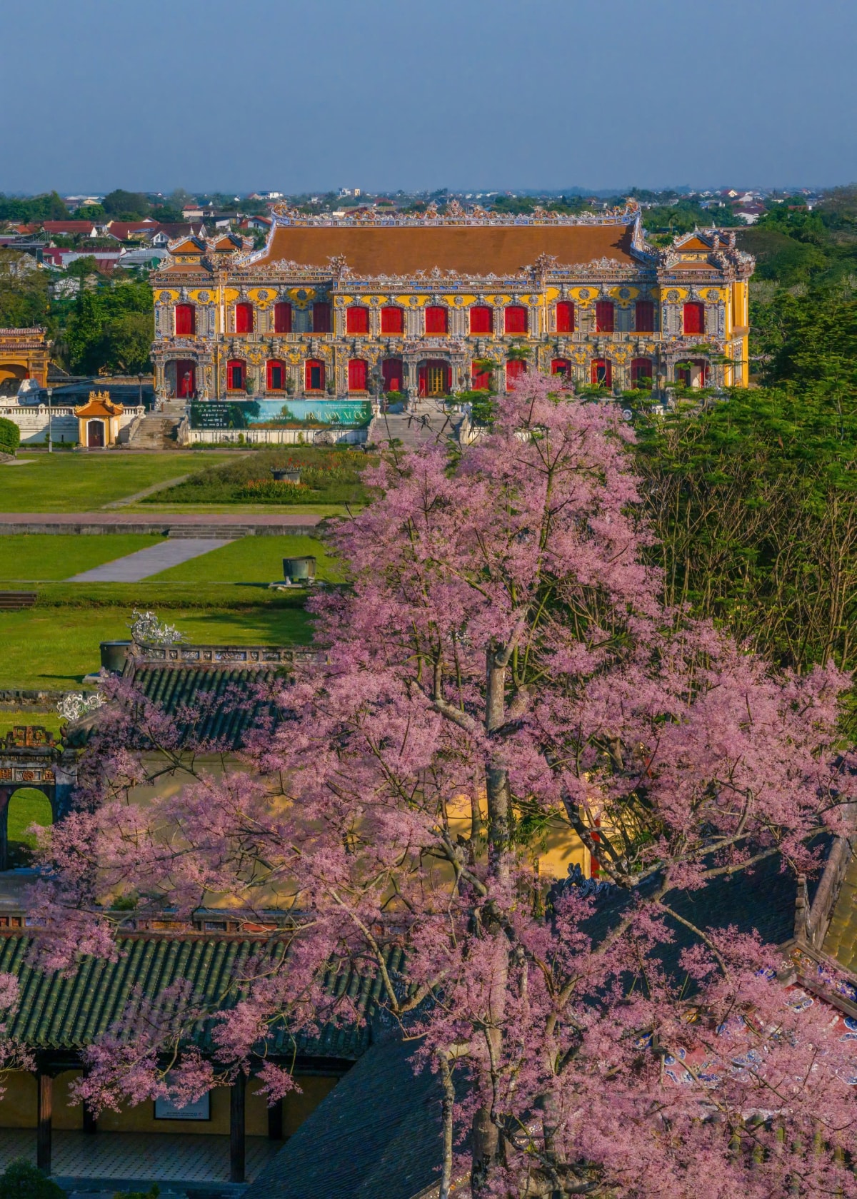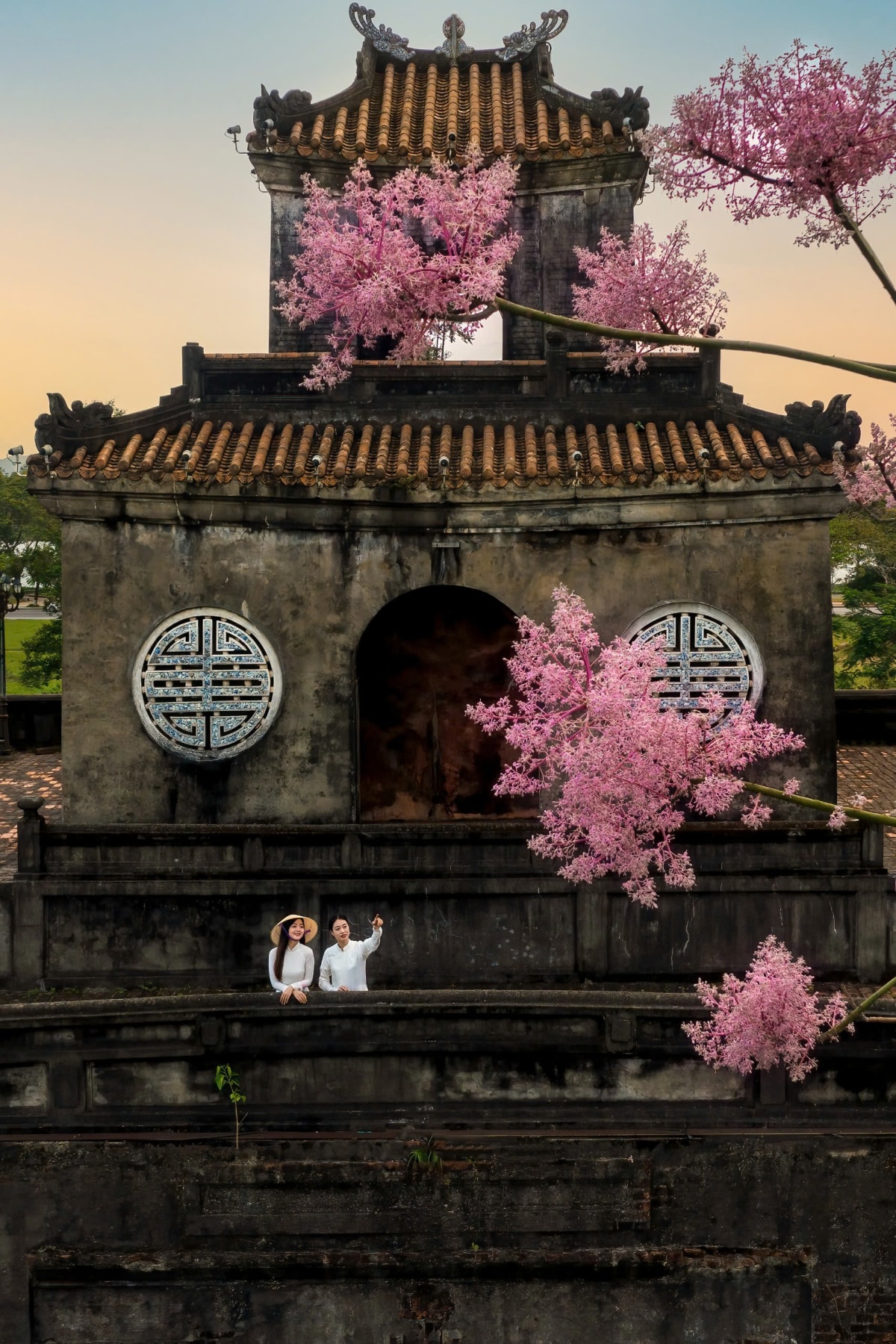 Hoa ngô đồng nở rộ trong Hoàng cung, nhuộm sắc hồng tím trên nền cổ kính của các công trình di tích những ngày cuối tháng 3.