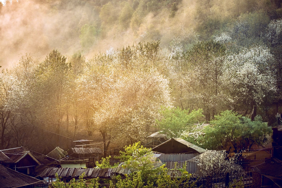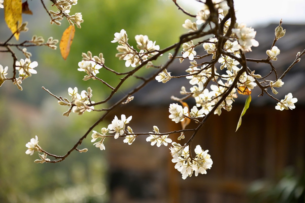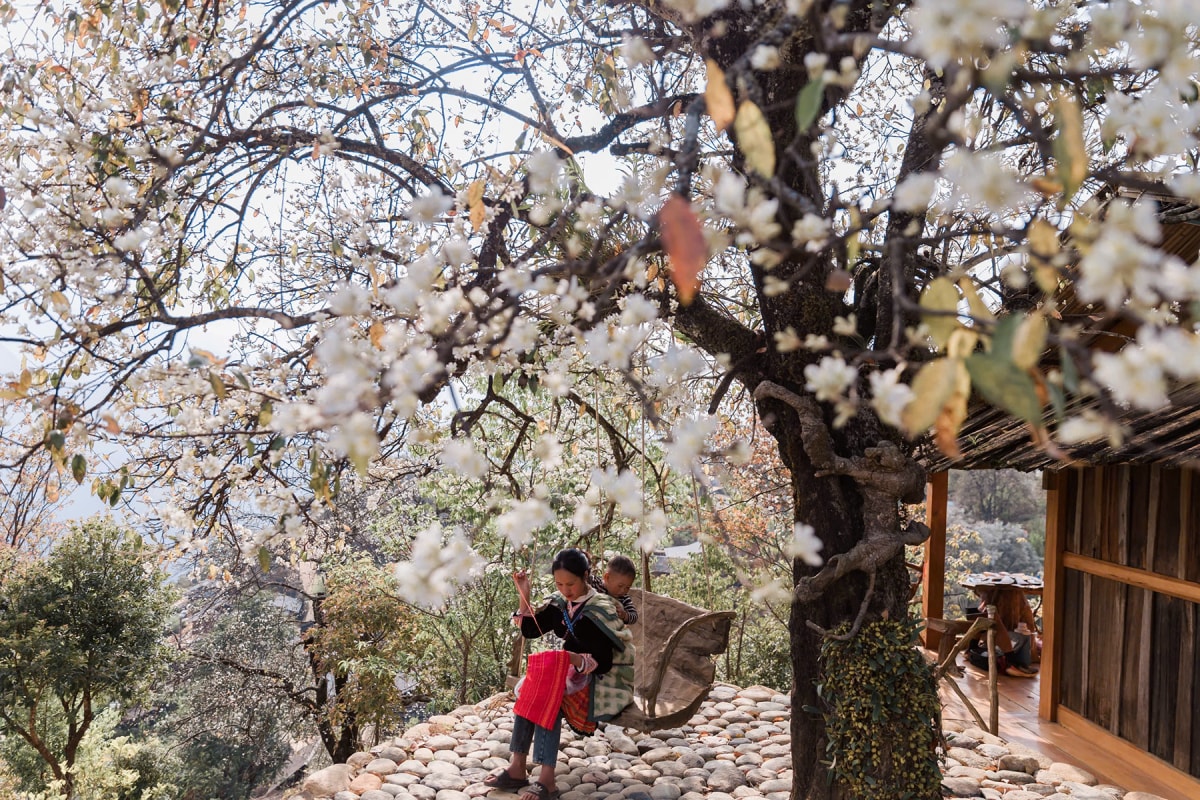 Mùa hoa sơn tra bung nở, phủ trắng bản Nậm Nghiệp, xã Ngọc Chiến những ngày đầu tháng 3, trở thành điểm đến hấp dẫn cho du khách chụp ảnh, trải nghiệm văn hoá bản địa.